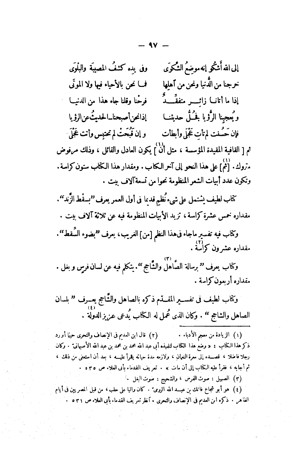 ثم [القافية المقيدة المؤسسة، مثل أن] «1» يكون العادل والقائل، وذلك مرفوض متروك. [ثم] على هذا النحو إلى آخر الكتاب. ومقدار هذا الكتاب ستون كراسة.