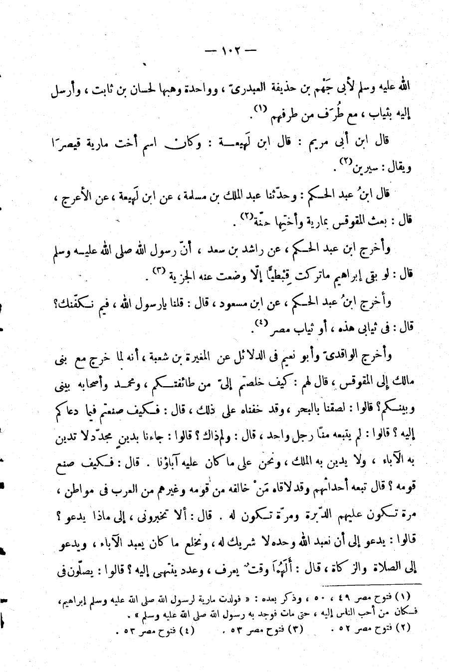 (¬1) فتوح مصر 49-50، وذكر بعده: "فولدت مارية لرسول الله صَلَّى اللَّهُ عَلَيْهِ وَسَلَّمَ إبراهيم، فكان من أحب الناس إليه، حتى مات فوجد به رسول الله صَلَّى اللَّهُ عَلَيْهِ وَسَلَّمَ".