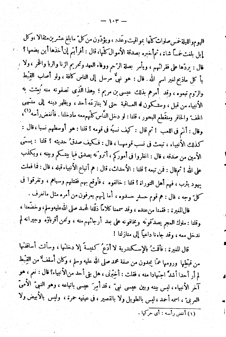 اليوم والليلة خمس صلوات كلها بمواقيت وعدد، ويؤدون من كل ما بلغ عشرين مثقالًا، وكل إبل بلغت خمسًا شاة، ثم أخبره بصدقة الأموال كلها، قال: أفرأيتم إن أخذها أين يضعها؟ قال: يردها على فقرائهم، ويأمر بصلة الرحم ووفاء العهد وتحريم الزنا والربا والخمر، ولا يأكل ما ذُبح لغير اسم الله. قال: هو نبي مرسل إلى الناس كافة، ولو أصاب القبط والروم تبعوه، وقد أمرهم بذلك عيسى بن مريم؛ وهذا الذي تصفونه منه بُعِثت به الأنبياء من قبل، وستكون له العاقبة حتى لا ينازعه أحد، ويظهر دينه إلى منتهى الخف