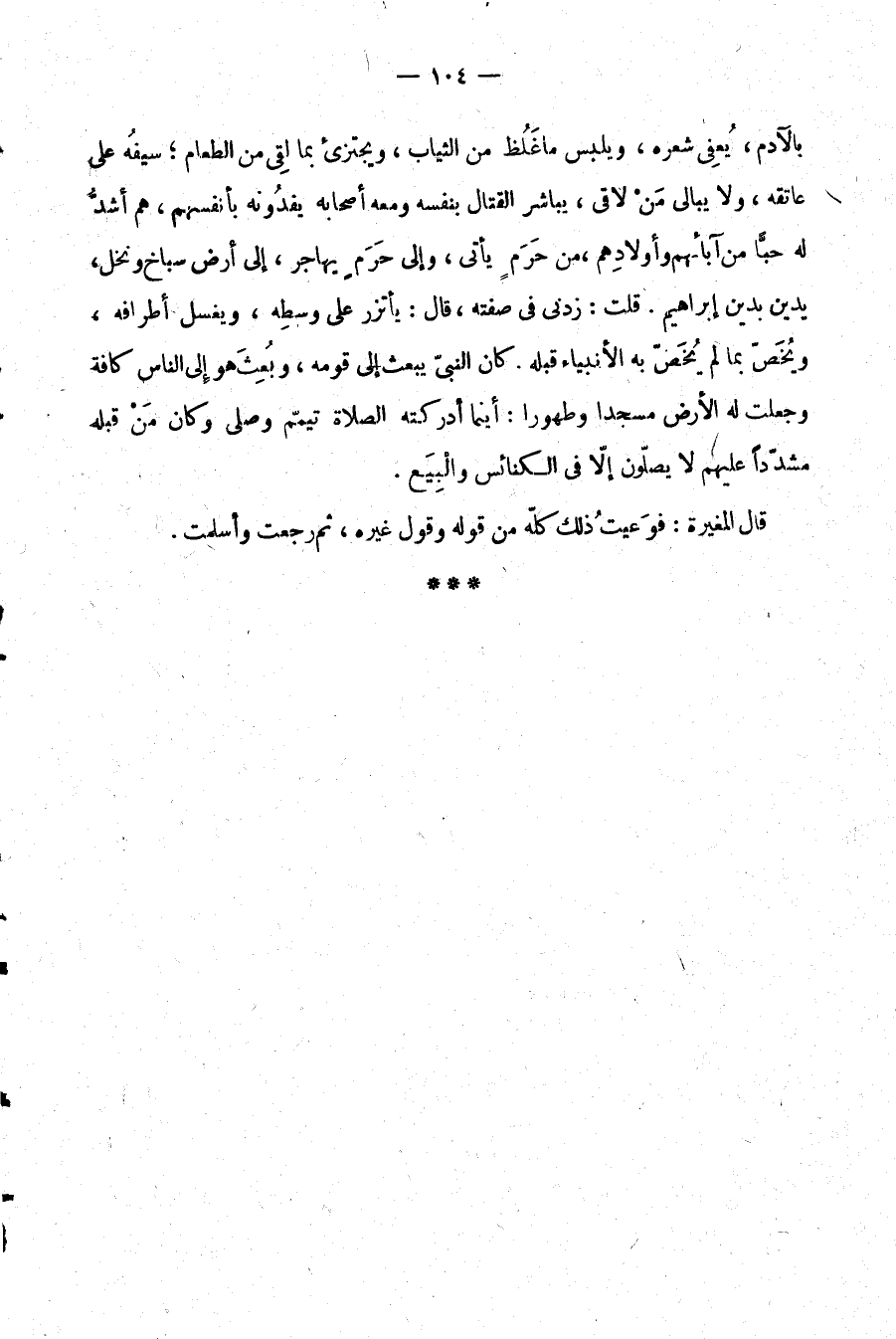 بالآدم، يُعفي شعره، ويلبس ما غلظ من الثياب، ويجتزئ بما لقي من الطعام؛ سيفه على عاتقه، ولا يبالي من لاقى، يباشر القتال بنفسه ومعه أصحابه يفدونه بأنفسهم، هم أشد له حبًّا من آبائهم وأولادهم، من حرم يأتي، وإلى حرم يهاجر، إلى أرض سباخ ونخل، يدين بدين إبراهيم. قلت: زدني في صفته، قال: يأترز على وسطه، ويغسل أطرافه، ويُخص بما لم يُخص به الأنبياء قبله. كان النبي يبعث إلى قومه، وبعث هو إلى الناس كافة وجعلت له الأرض مسجدًا وطهورًا: أينما أدركته الصلاة تيمم وصلى وكان من قبله مشددًا عليهم لا يصلون إلا في الكنائس والبيع.