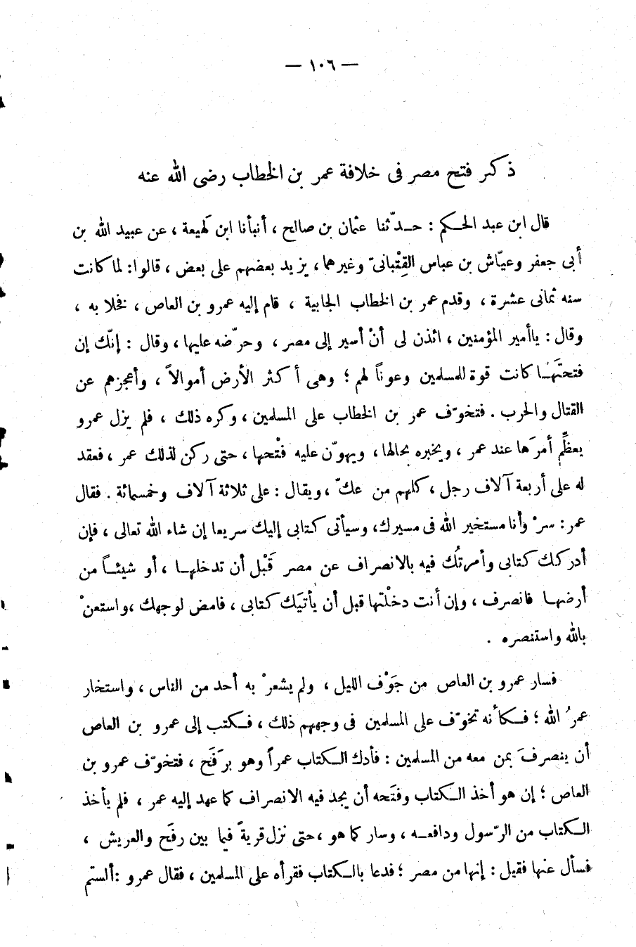 قال ابن عبد الحكم: حدثنا عثمان بن صالح، أنبأنا ابن لهيعة، عن عبيد الله بن أبي جعفر وعياش بن عباس القتباني وغيرهما، يزيد بعضهم على بعض، قالوا: لما كانت سنة ثماني عشرة، وقدم عمر بن الخطاب الجابية، قام إليه عمرو بن العاص، فخلا به، وقال: يا أمير المؤمنين، ائذن لي أن أسير إلى مصر، وحرضه عليها، وقال: إنك إن فتحتها كانت قوة للمسلمين وعونًا لهم؛ وهي أكثر الأرض أموالًا، وأعجزهم عن القتال والحرب. فتخوف عمر بن الخطاب على المسلمين، وكره ذلك، فلم يزل عمرو يعظم أمرها عند عمر، ويخبره بحالها، ويهون عليه فتحها، حتى ركن لذلك عمر، فعقد له على أربعة آلاف رجل، كلهم من عك، ويقال: على ثلاثة آلاف وخمسمائة. فقال عمر: سر وأنا مستخير الله في مسيرك، وسيأتي إليك سريعًا إن شاء الله تعالى، فإن أدركك كتابي وأمرتك فيه بالانصراف عن مصر قبل أن تدخلها، أو شيئًا من أرضها فانصرف، وإن أنت دخلتها قبل أن يأتيك كتابي، فامض لوجهك، واستعن بالله واستنصره.