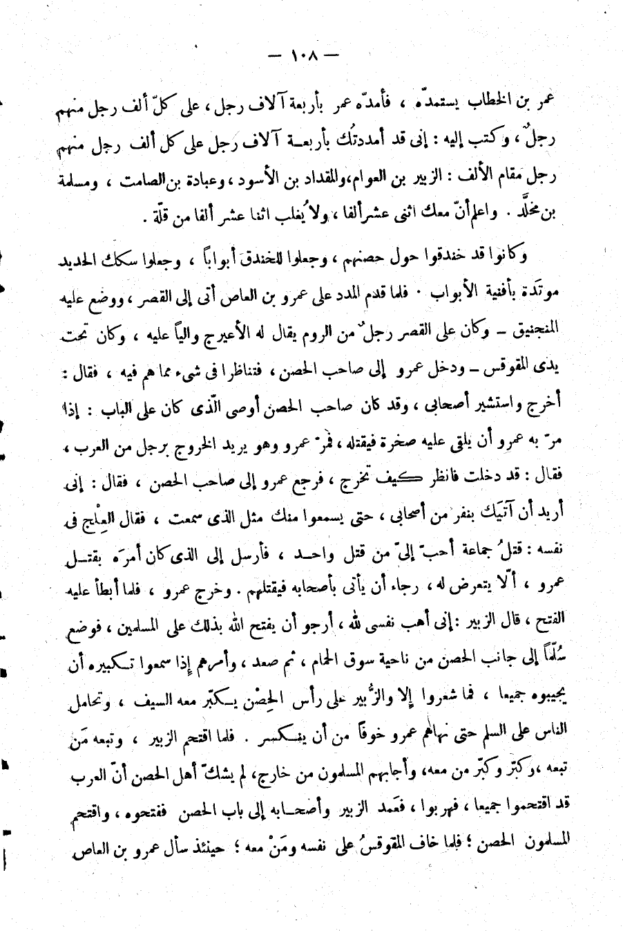 عمرو وهو يريد الخروج برجل من العرب، فقال: قد دخلت فانظر كيف تخرج، فرجع عمرو إلى صاحب الحصن، فقال: إني أريد أن آتيك بنفر من أصحابي، حتى يسمعوا منك مثل الذي سمعت، فقال العلج في نفسه: قتل جماعة أحب إلي من قتل واحد، فأرسل إلى الذي كان أمره بقتل عمرو، ألا يتعرض له، رجاء أن يأتي بأصحابه فيقتلهم. وخرج عمرو، فلما أبطأ عليه الفتح، قال الزبير: إني أهب نفسي لله، أرجو أن يفتح الله بذلك على المسلمين، فوضع سلمًا إلى جانب الحصن من ناحية سوق الحمام، ثم صعد، وأمرهم إذا سمعوا تكبيره أن يجيبوه جميعًا، فما شعروا إلا والزبير على رأس الحصن يكبر معه السيف، وتحامل الناس على السلم حتى نهاهم عمرو خوفًا من أن ينكسر. فلما اقتحم الزبير، وتبعه من تبعه، وكبر وكبر من معه، وأجابهم المسلمون من خارج، لم يشك أهل الحصن أن العرب قد اقتحموا جميعًا، فهربوا، فعمد الزبير وأصحابه إلى باب الحصن ففتحوه، واقتحم المسلمون الحصن؛ فلما خاف المقوقس على نفسه ومن معه؛ حينئذ سأل عمرو بن العاص