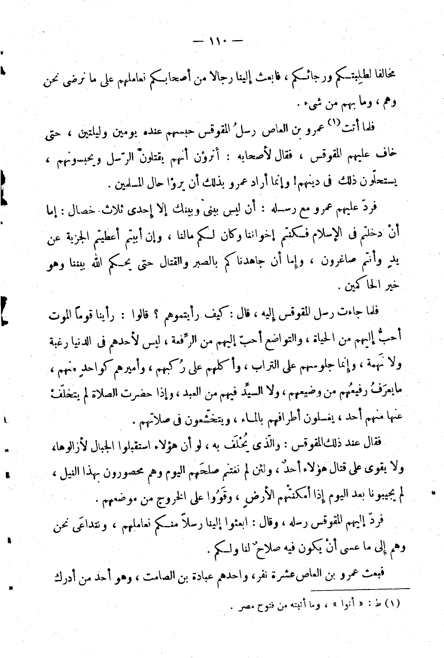 فرد عليهم عمرو مع رسله: أن ليس بيني وبينك إلا إحدى ثلاث خصال: إما أن دخلتم في الإسلام فكنتم إخواننا وكان لكم ما لنا، وإن أبيتم أعطيتم الجزية عن يد وأنتم صاغرون، وإما أن جاهدناكم بالصبر والقتال حتى يحكم الله بيننا وهو خير الحاكمين.