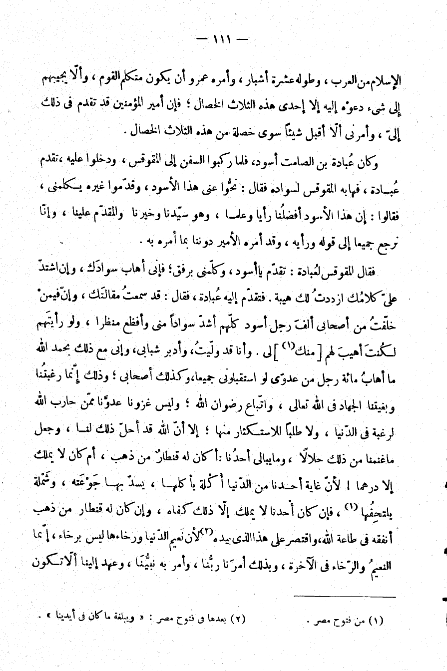 فقال المقوقس لعبادة: تقدم يا أسود، وكلمني برفق؛ فإني أهاب سوادك، وإن اشتد علي كلامك ازددت لك هيبة، فتقدم إليه عبادة، فقال: قد سمعت مقالتك، وإن فيمن خلفت من أصحابي ألف رجل أسود كلهم أشد سوادًا مني وأفظع منظرًا ولو رأيتهم لكنت أهيب "منك" (¬1) لي. وأنا قد وليت، وأدبر شبابي، وإني مع ذلك بحمد الله ما أهاب مائة رجل من عدوي لو استقبلوني جميعًا، وكذلك أصحابي؛ وذلك إنما رغبتنا وبغيبتا الجهاد في الله تعالى، واتباع رضوان الله؛ وليس غزونا عدونا ممن حارب الله لرغبة في الدنيا، ولا طلبًا للاستكثار منها؛ إلا أن الله قد أحل ذلك لنا، وجعل ما غنمنا من ذلك حلالًا، وما يبالي أحدنا: أكان له قنطار من ذهب، أم كان لا يملك إلا درهمًا! لأن غاية أحدنا من الدنيا أكلة يأكلها، يسد بها جوعته، وشملة يلتحفها، فإن كان أحدنا لا يملك إلا ذلك كفاه، وإنا كان له قنطار من ذهب أنفقه في طاعة الله، واقتصر على هذا الذي بيده (¬2) ؛ لأن نعيم الدنيا ورخاءها ليس برخاء، إنما النعيم والرخاء في الآخرة، وبذلك أمرنا ربنا، وأمر به نبينا، وعهد إلينا ألا تكون