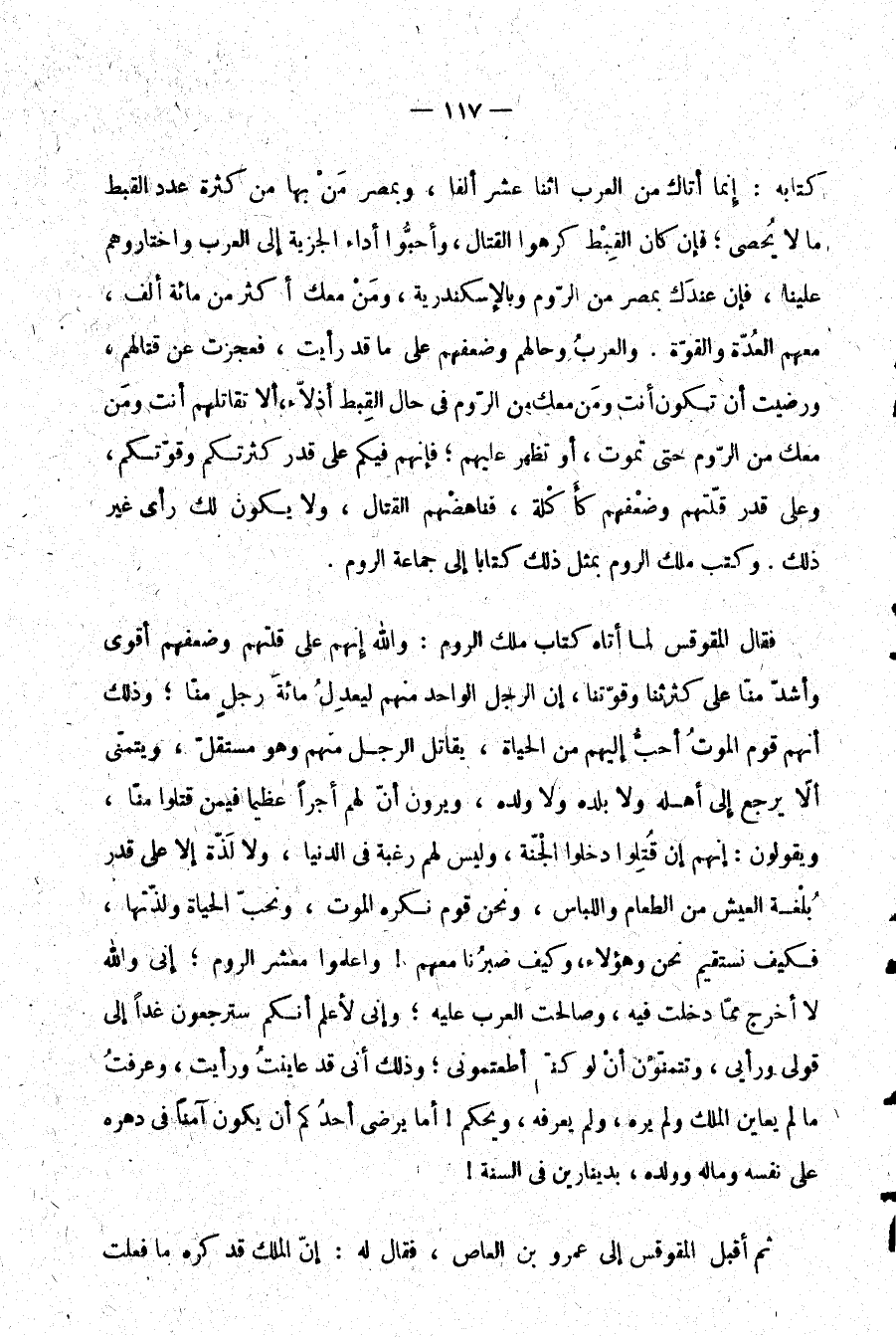 أتاك من العرب اثنا عشر ألفًا، وبمصر من بها من كثرة عدد القبط ما لا يحصى؛ فإن كان القبط كرهوا القتال، وأحبوا أداء الجزية إلى العرب واختاروهم علينا، فإن عندك بمصر من الروم وبالإسكندرية، ومن معك أكثر من مائة ألف، معهم العدة والقوة. والعرب وحالهم وضعفهم على ما قد رأيت، فعجزت عن قتالهم، ورضيت أن تكون أنت ومن معك في حال القبط أذلاء، ألا تقاتلهم أنت ومن معك من الروم حتى تموت، أو تظهر عليهم؛ فإنهم فيكم على قدر كثرتكم وقوتكم، وعلى قدر قلتهم وضعفهم كأكلة، فناهضهم القتال، ولا يكون لك رأي غير ذلك. وكتب ملك الروم بمثل ذلك كتابًا إلى جماعة الروم.