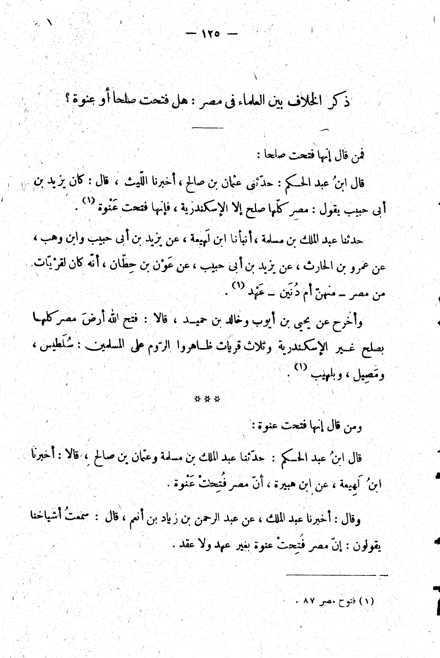 وقال: أخبرنا عبد الملك، عن عبد الرحمن بن زياد بن أنعم، قال: سمعت أشياخنا يقولون: إن مصر فتحت عنوة بغير عهد ولا عقد.