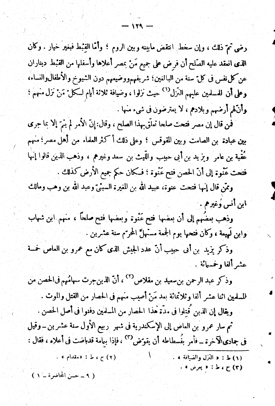 رضي تم ذلك، وإن سخط انتقض ما بينه وبين الروم؛ وأما القبط فبغير خيار. وكان الذي انعقد عليه الصلح أن فرض على جميع من بمصر أعلاها وأسفلها من القبط ديناران عن كل نفس في كل سنة من البالغين؛ شريفهم ووضيعهم دون الشيوخ والأطفال والنساء، وعلى أن للمسلمين عليهم النزل (¬1) حيث نزلوا، وضيافة ثلاثة أيام لكل من نزل منهم؛ وأن لهم أرضهم وبلادهم، لا يعترضون في شيء منها.