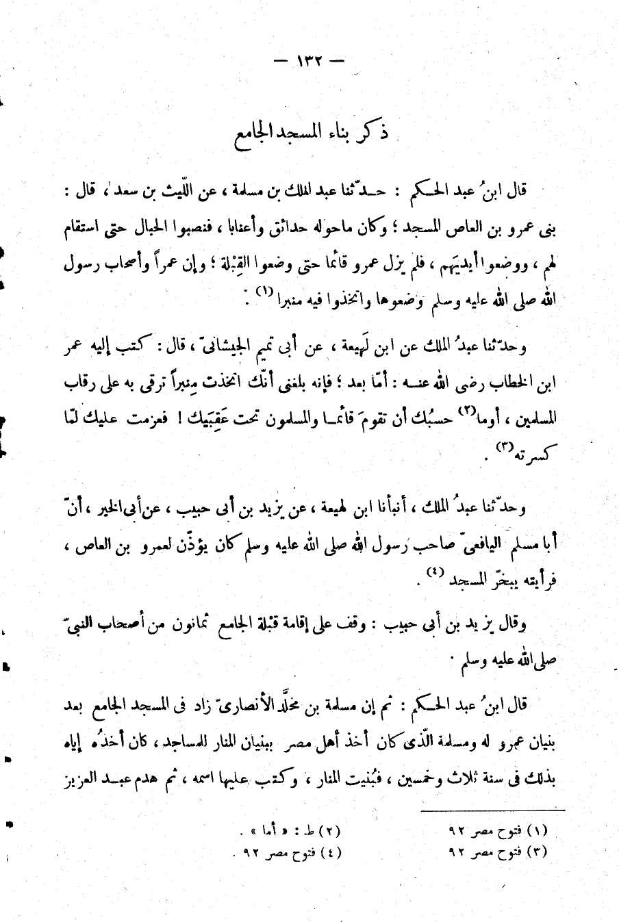 وقال يزيد بن أبي حبيب: وقف على إقامة قبلة الجامع ثمانون من أصحاب النبي صَلَّى اللَّهُ عَلَيْهِ وَسَلَّمَ.