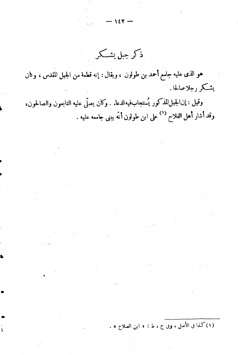 وقيل: إن الجبل المذكور يُستجاب فيه الدعاء. وكان يصلي عليه التابعون والصالحون وقد أشار أهل الفلاح (¬1) على ابن طولول أنه يبني جامعه عليه.