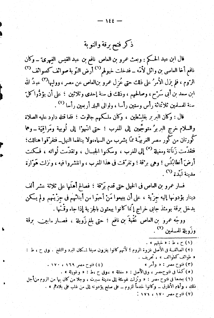 (¬6) بعدها في فتوح مصر: "ونزلت نفوسة إلى مدينة سيرت، وجلا من كان بها من الروم من أجل ذلك، وأقام الأفارق -وكانوا خدمًا للروم- على صلح يؤدونه إلى من غلب من بلادهم".