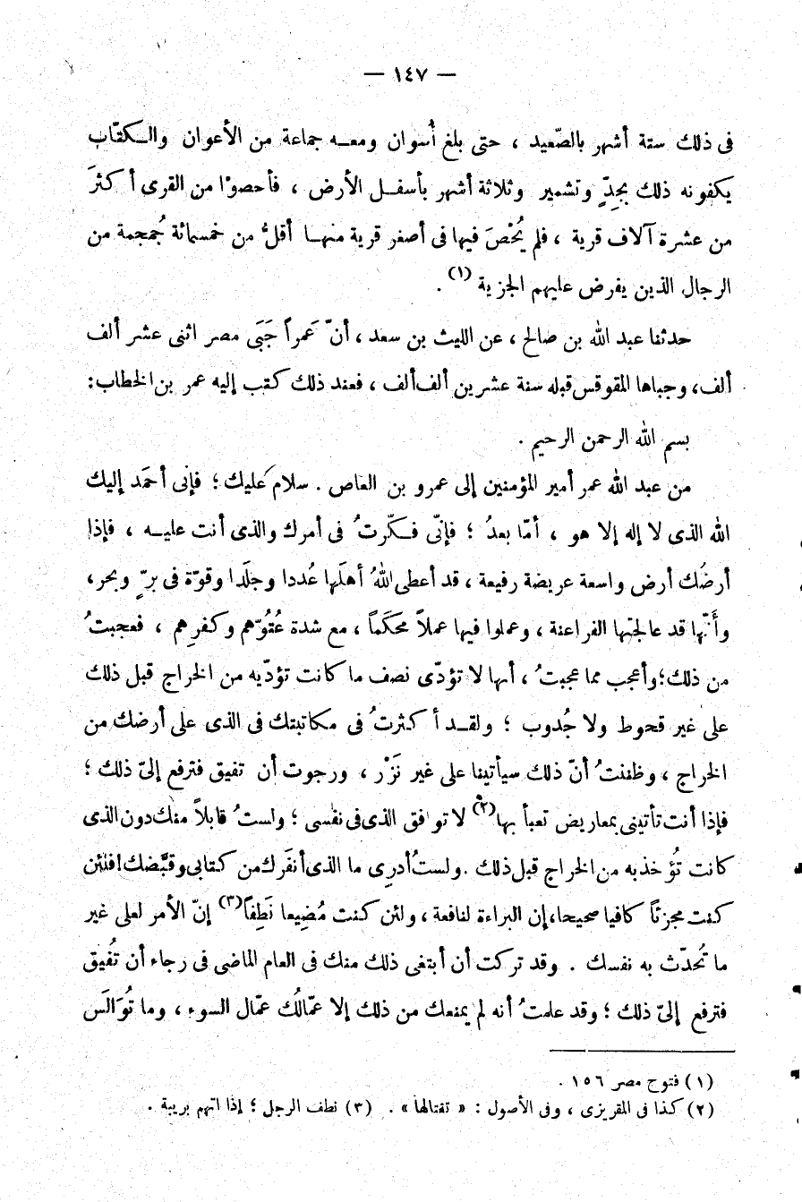حدثنا عبد الله بن صالح، عن الليث بن سعد، أن عمرًا جبى مصر اثني عشر ألف ألف، وجباها المقوقس قبله سنة عشرين ألف ألف، فعند ذلك كتب إليه عمر بن الخطاب: