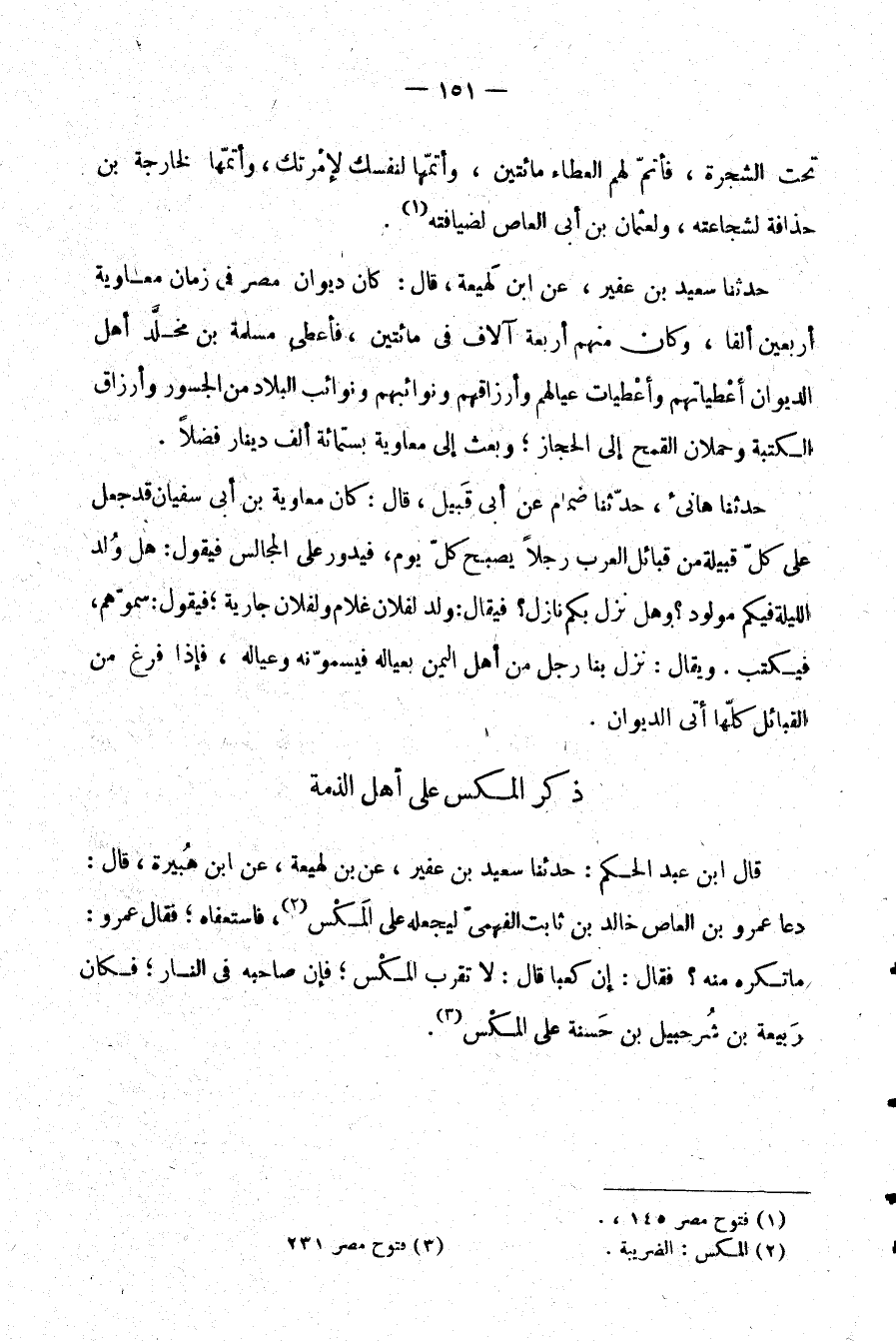 قال ابن عبد الحكم: حدثنا سعيد بن عفير، عن بن لهيعة، عن ابن هبيرة، قال: دعا عمرو بن العاص خالد بن ثابت الفهمي ليجعله على المكس (¬2) ، فاستعفاه؛ فقال عمرو: ما تكره منه؟ فقال: إن كعبًا قال: لا تقرب المكس؛ فإن صاحبه في النار؛ فكان ربيعة بن شرحبيل بن حسنة على المكس (¬3) .