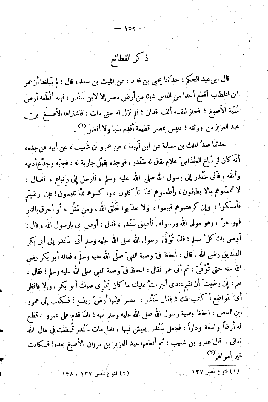 قال ابن عبد الحكم: حدثنا يحيى بن خالد، عن الليث بن سعد، قال: لم يبلغنا أن عمر بن الخطاب أقطع أحدًا من الناس شيئًا من أرض مصر إلا لابن سندر، فإنه أقطعه أرض منية الأصبغ؛ فحاز لنفسه ألف فدان؛ فلم تزل له حتى مات؛ فاشتراها الأصبغ بن عبد العزيز من ورثته؛ فليس بمصر قطيعة أقدم منها ولا أفضل (¬1) .