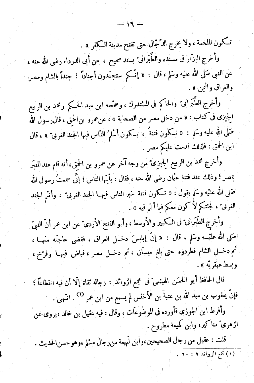 وأخرج الطبراني في الكبير والأوسط، وأبو الفتح الأزدي عن ابن عمر أن النبي صَلَّى اللَّهُ عَلَيْهِ وَسَلَّمَ، قال: "إن إبليس دخل العراق، فقضى حاجته منها، ثم دخل الشام فطردوه حتى بلغ ميسان، ثم دخل مصر، فباض فيها وفرخ، وبسط عبقريه".