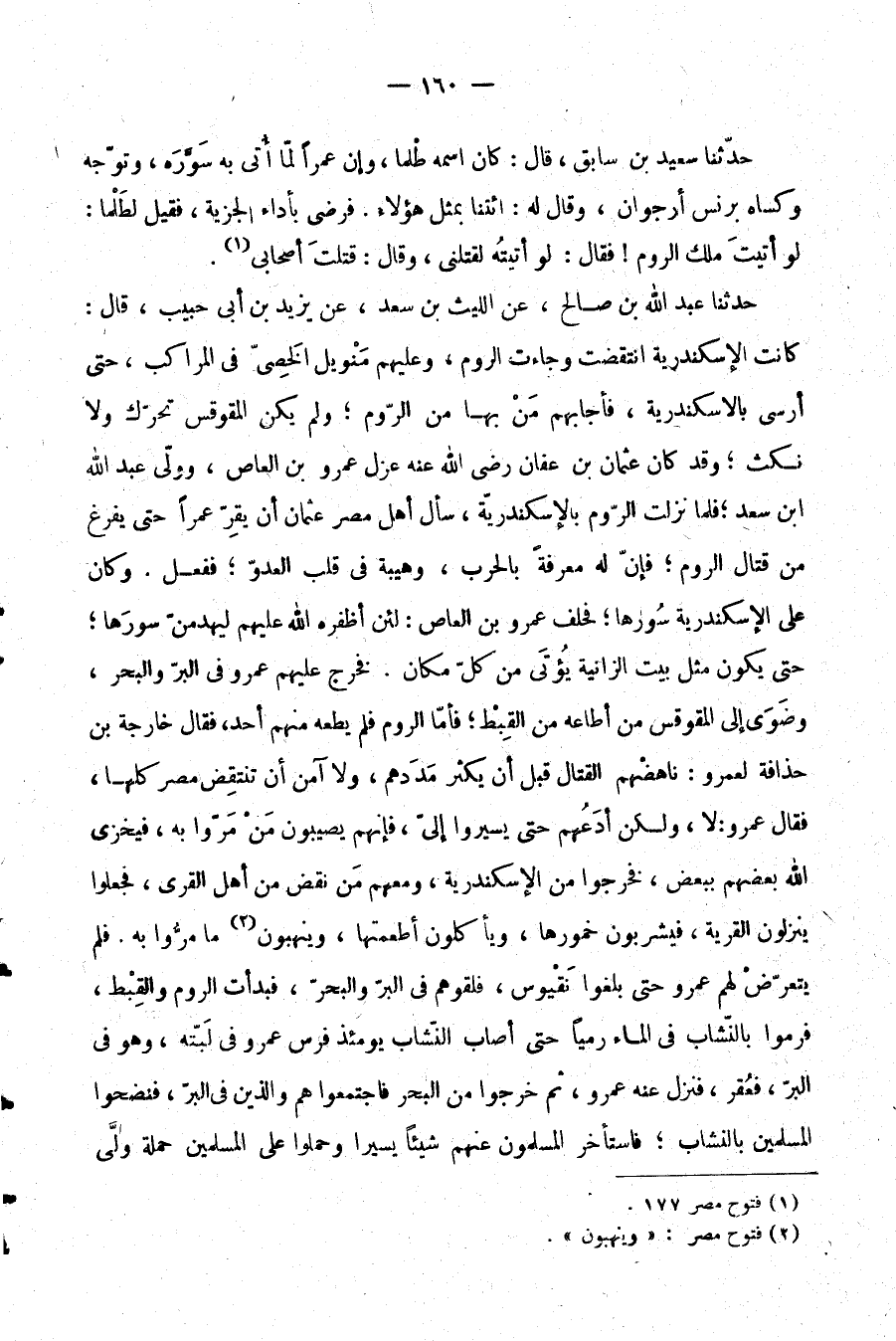 حدثنا عبد الله بن صالح، عن الليث بن سعد، عن يزيد بن أبي حبيب، قال: كانت الإسكندرية انتقضت وجاءت الروم، وعليهم منويل الخصي في المراكب، حتى أرسى بالإسكندرية، فأجابهم من بها من الروم؛ ولم يكن المقوقس تحرك ولا نكث؛ وقد كان عثمان بن عفان رضي الله عنه عزل عمرو بن العاص، وولى عبد الله بن سعد؛ فلما نزلت الروم بالإسكندرية، سأل أهل مصر عثمان أن يقر عمرًا حتى يفرغ من قتال الروم؛ فإن له معرفة بالحرب، وهيبة في قلب العدو؛ ففعل. وكان على الإسكندرية سورها؛ فحلف عمرو بن العاص: لئن أظفره الله عليهم ليهدمن سورها؛ حتى يكون مثل بيت الزانية يُؤتى من كل مكان. فخرج عليهم عمرو في البر والبحر، وضوى إلى المقوقس من أطاعه من القبط؛ فأما الروم فلم يطعه منهم أحد، فقال خارجة بن حذافة لعمرو: ناهضهم القتال قبل أن يكثر مددهم، ولا آمن أن تنتفض مصر كلها، فقال عمرو: لا، ولكن أدعهم حتى يسيروا إلي، فإنهم يصيبون من مروا به، فيجزي الله بعضهم ببعض، فخرجوا من الإسكندرية، ومعهم من نقض من أهل القرى فجعلوا ينزلون القرية، فيشربون خمورها، ويأكلون أطعمتها، وينهبون (¬2) ما مروا به. فلم يتعرض لهم عمرو حتى بلغوا نقيوس، فلقوهم في البر والبحر، فبدأت الروم والقبط، فرموا بالنشاب في الماء رميا حتى أصاب النشاب يومئذ فرس عمرو في لبته، وهو في البر، فعقر، فنزل عنه عمرو، ثم خرجوا من البحر فاجتمعوا هم والذين في البر، فنضحوا المسلمين بالنشاب؛ فاستأخر المسلمون عنهم شيئا يسيرا وحملوا على المسلمين حملة ولى