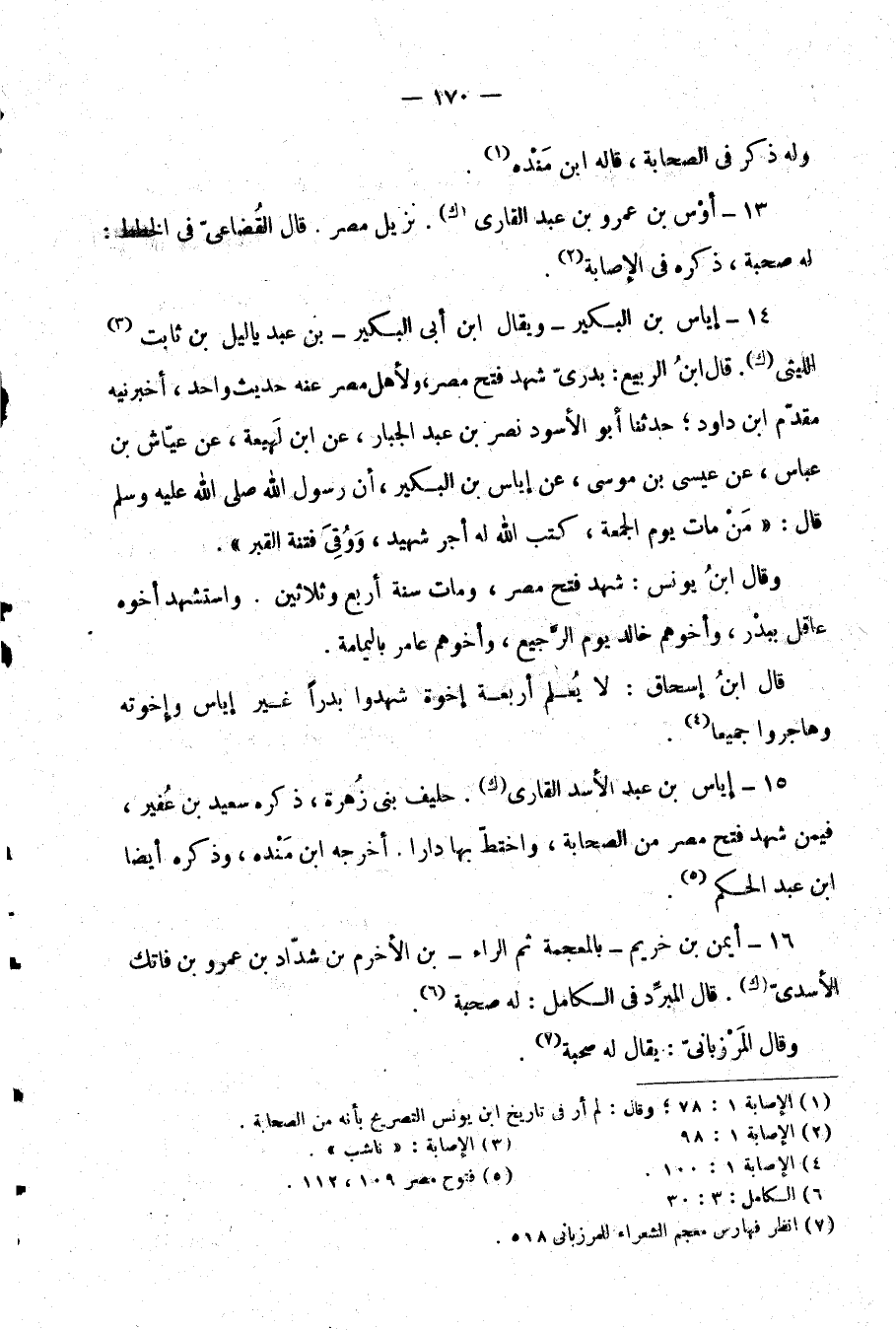 15- إياس بن عبد الأسد القاري "ك". حليف بني زهرة، ذكره سعيد بن عفير، فيمن شهد فتح مصر من الصحابة، واختط بها دارا. أخرجه ابن منده، وذكره أيضًا ابن عبد الحكم (¬5) .