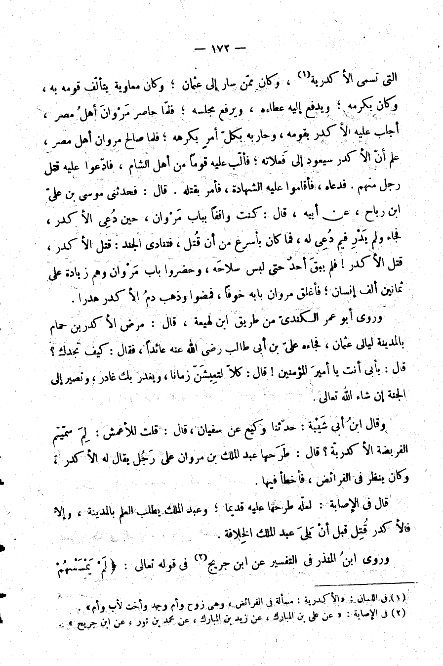 التي تسمى الأكدرية (¬1) ، وكان ممن سار إلى عثمان؛ وكان معاوية يتألف قومه به، وكان يكرمه؛ ويدفع إليه عطاءه، ويرفع مجلسه؛ فلما حاصر مروان أهل مصر، أجلب عليه الأكدر بقومه، وحاربه بكل أمر يكرهه؛ فلما صالح مروان أهل مصر، علم أن الأكدر سيعود إلى فعلاته؛ فألب عليه قوما من أهل الشام، فادعوا عليه قتل رجل منهم. فدعاه، فأقاموا عليه الشهادة، فأمر بقتله. قال: فحدثني موسى بن علي بن رباح، عن أبيه، قال: كنت واقفا بباب مروان، حين دعي الأكدر، فجاء ولم يدر فيم دُعي له، فما كان بأسرع من أن قُتل، فتنادى الجند: قتل الأكدر، قتل الأكدر! فلم يبق أحد حتى لبس سلاحه، وحضروا باب مروان وهم زيادة على ثمانين ألف إنسان؛ فأغلق مروان بابه خوفا، فمضوا وذهب دم الأكدر هدرًا.