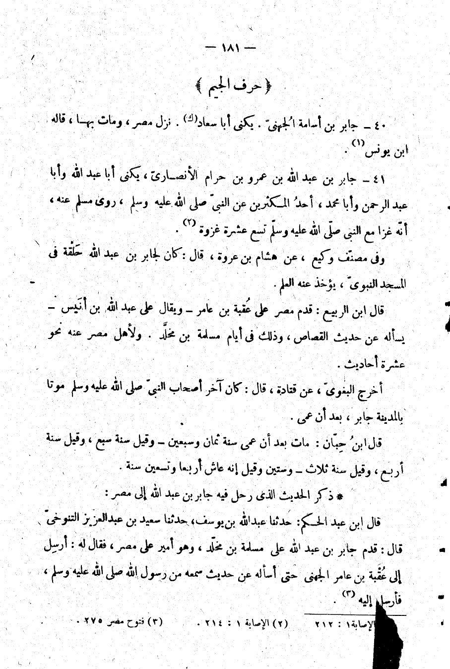 40- جابر بن أسامة الجهني. يكنى أبا سعاد. نزل مصر، ومات بها، قاله ابن يونس (¬1) .