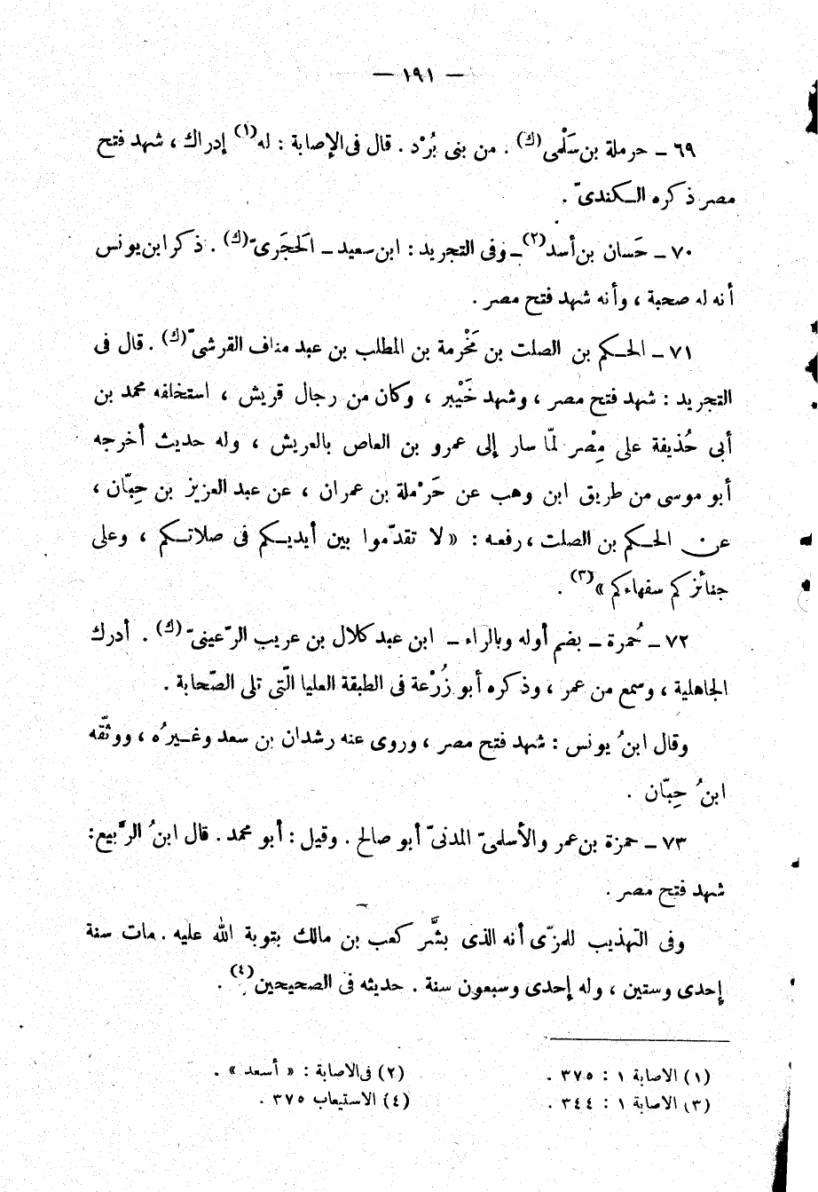 69- حرملة بن سلمى "ك". من بني برد. قال في الإصابة: له (¬1) إدراك، شهد فتح مصر ذكره الكندي.