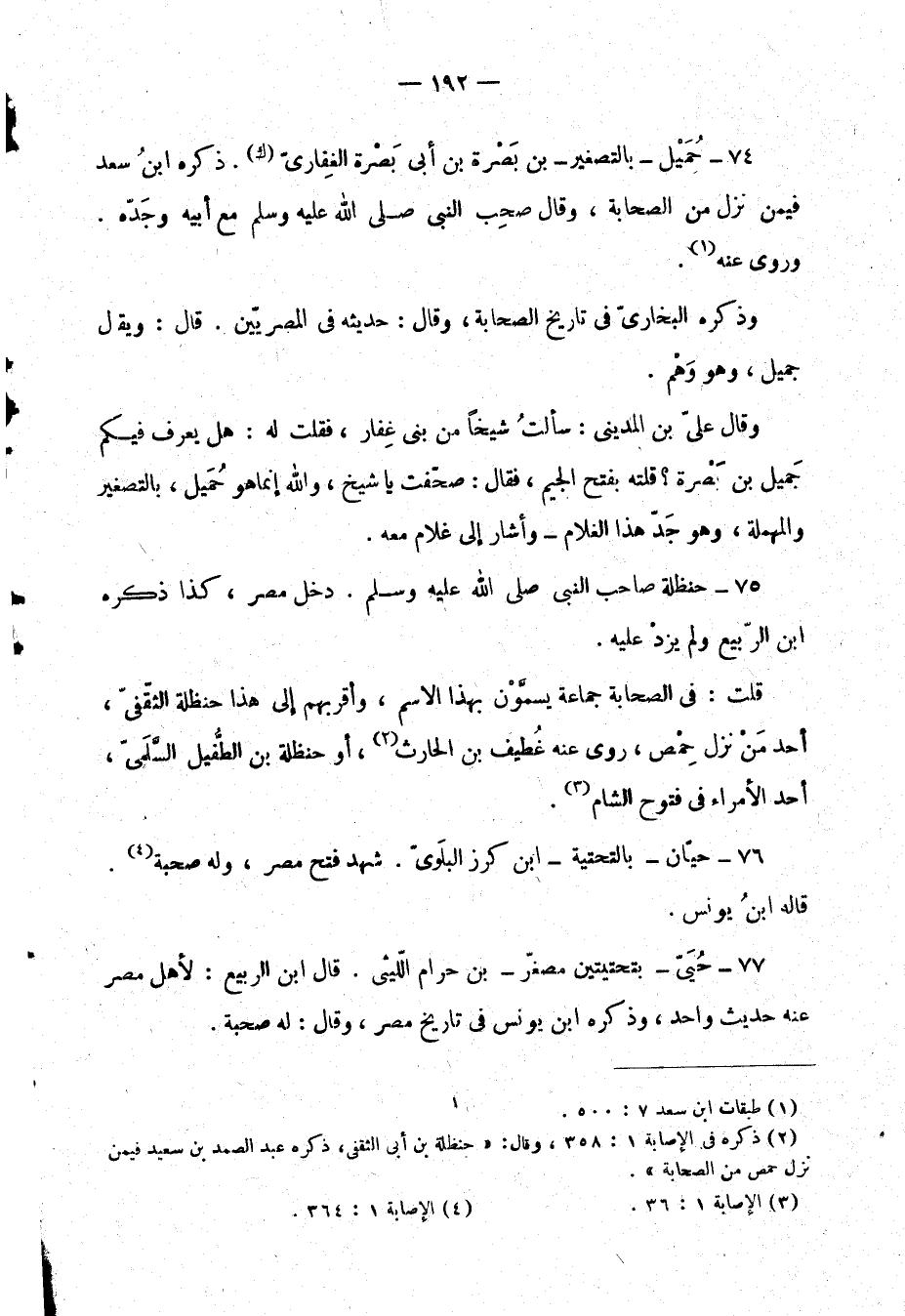 وقال علي بن المدني: سألت شيخًا من بني غفار، فقلت له: هل يعرف فيكم جميل بن بصرة؟ قلته بفتح الجيم، فقال: صحفت يا شيخ، والله إنما هو حُمَيل، بالتصغير والمهملة، وهو جد هذا الغلام -وأشار إلى غلام معه.