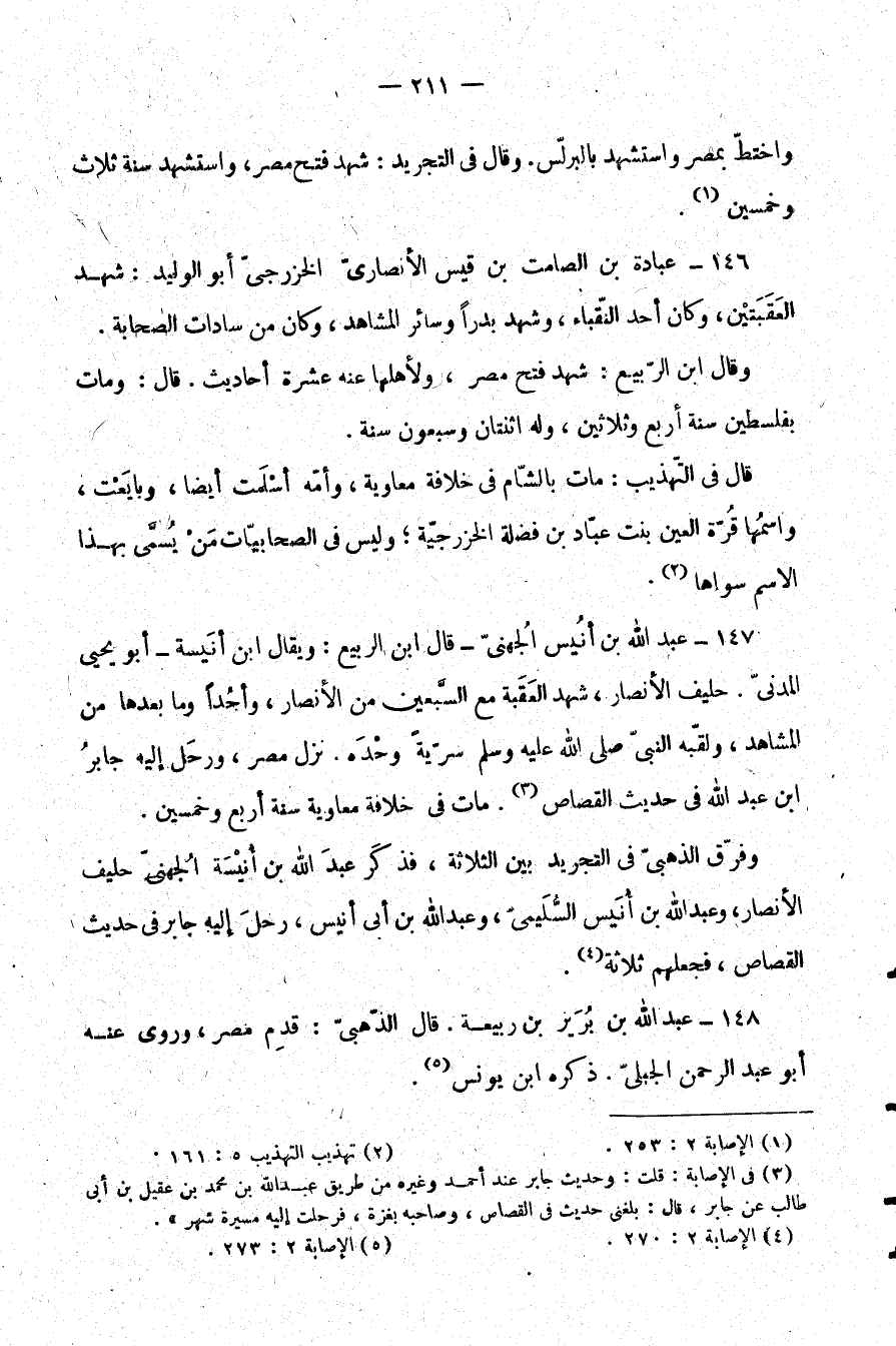 (¬3) في الإصابة: قلت: وحديث جابر عند أحمد وغيره من طريق عبد الله بن محمد بن عقيل بن أبي طالب عن جابر، قال: بلغني حديث في القصاص، وصاحبه بغزة، فرحلت إليه مسيرة شهر.