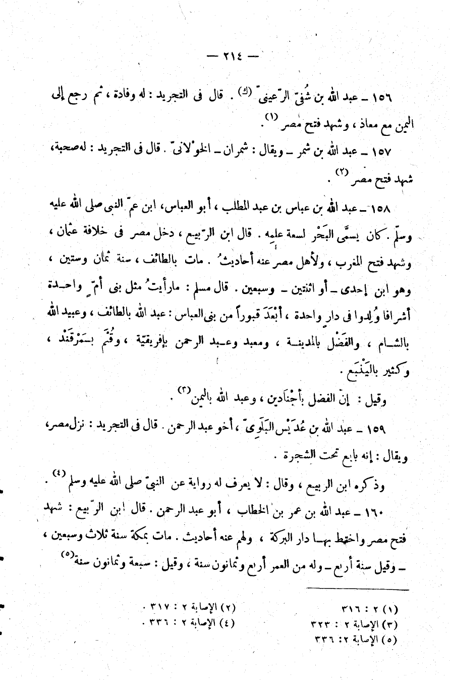 158- عبد الله بن عباس بن عبد المطلب، أبو العباس، ابن عم النبي صَلَّى اللَّهُ عَلَيْهِ وَسَلَّمَ. كان يُسمى البحر لسعة علمه. قال ابن الربيع، دخل مصر في خلافة عثمان، وشهد فتح المغرب، ولأهل مصر عنه أحاديث. مات بالطائف، سنة ثمان وستين، وهو ابن إحدى -أو اثنين- وسبعين. قال مسلم: ما رأيت مثل بني أم واحدة أشرافًا ولدوا في دار واحدة، أبعد قبورًا من بني العباس: عبد الله بالطائف، وعبيد الله بالشام، والفضل بالمدينة، ومعبد وعبد الرحمن بإفريقية، وقثم بمرقند، وكثير بالينبع.