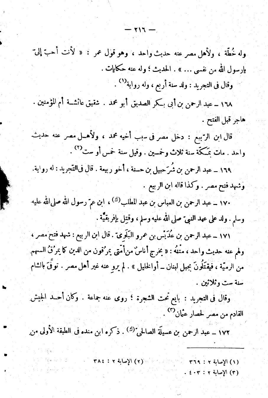169- عبد الرحمن بن شرحبيل بن حسنة، أخو ربيعة. قال في التجريد: له رواية. وشهد فتح مصر. وكذا قاله ابن الربيع.