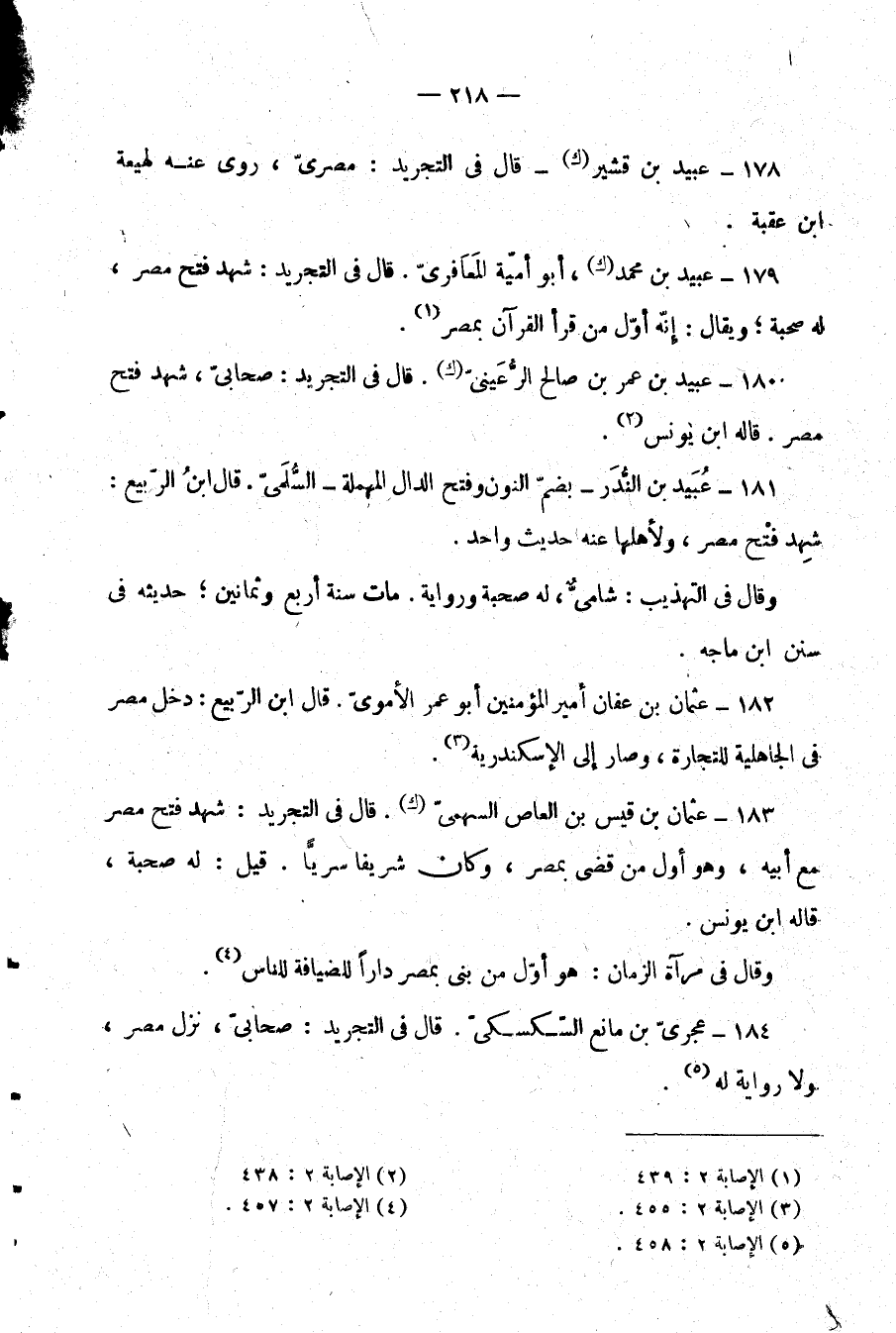 179- عبيد بن محمد "ك"، أبو أمية المعافري. قال في التجريد: شهد فتح مصر، له صحبة؛ ويقال: إنه أول من قرأ القرآن بمصر (¬1) .