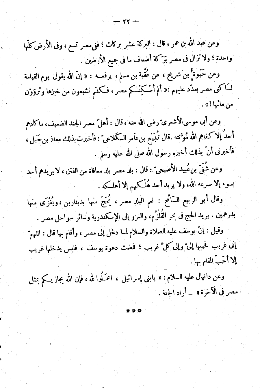 وعن عبد الله بن عمر، قال: البركة عشر بركات؛ ففي مصر تسع، وفي الأرض كلها واحدة؛ ولا تزال في مصر بركة أضعاف ما في جميع الأرضين.