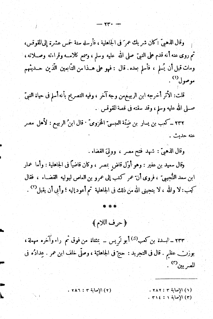 233- لبدة بن كعب "ك" أبو تريس -بمثناة من فوق ثم راء وآخره مهملة، بوزن عظيم. قال في التجريد: حج في الجاهلية، وصلى خلف ابن عمر. عداده في المصريين (¬3) .