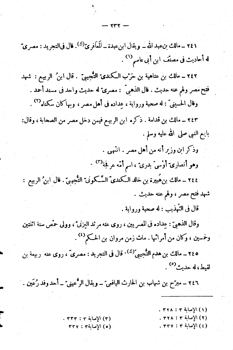 243- مالك بن قدامة. ذكره ابن الربيع فيمن دخل مصر من الصحابة، وقال: بايع النبي صَلَّى اللَّهُ عَلَيْهِ وَسَلَّمَ.