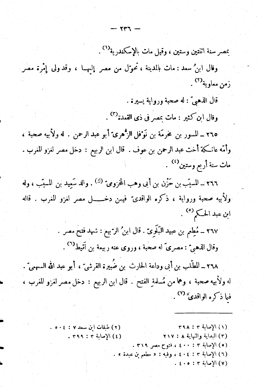 268- المطلب بن أبي وداعة الحارث بن ضبيرة القرشي، أبو عبد الله السهمي. له ولأبيه صحبة، وهما من مسلمة الفتح. قال ابن الربيع: دخل مصر لغزو المغرب، فيما ذكره الواقدي (¬7) .