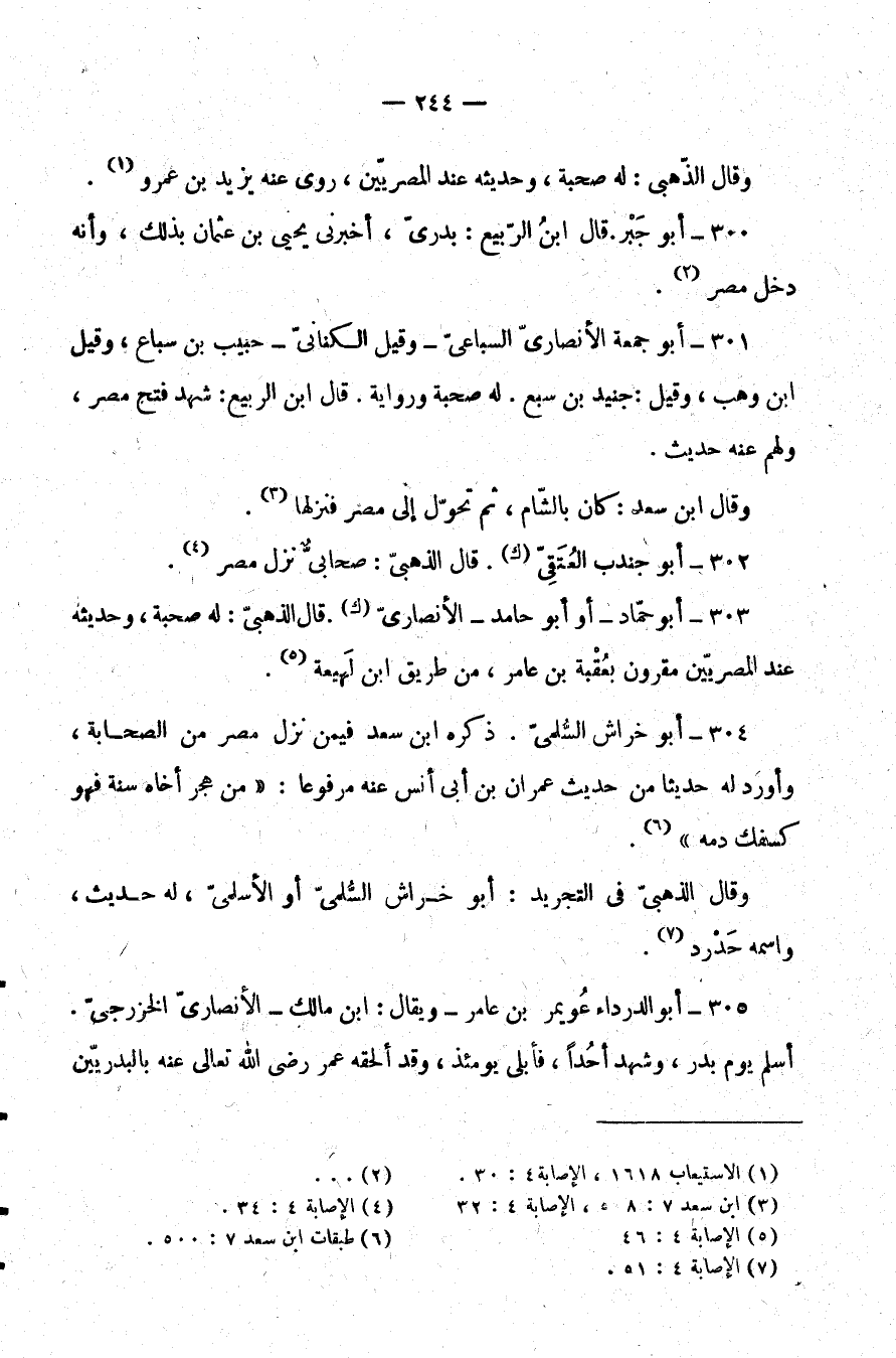 301- أبو جمعة الأنصاري السباعي -وقيل الكناني- حبيب بن سباع، وقيل ابن وهب، وقيل: جنيد بن سبع. له صحبة ورواية. قال ابن الربيع: شهد فتح مصر، ولهم عنه حديث.