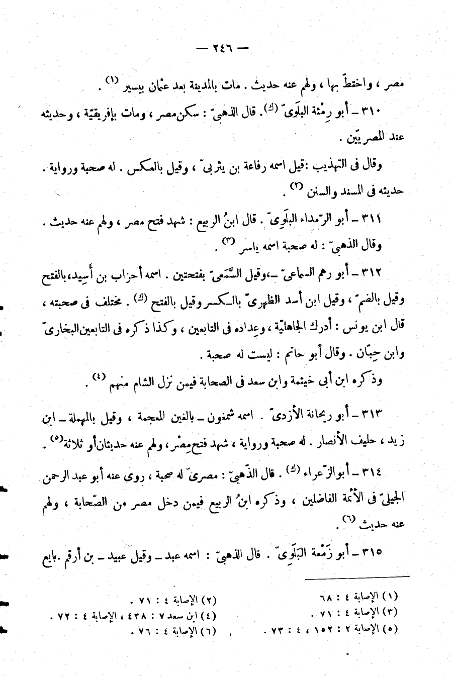 311- أبو الرمداء البلوي. قال ابن الربيع: شهد فتح مصر، ولهم عنه حديث. وقال الذهبي: له صحبة اسمه ياسر (¬3) .