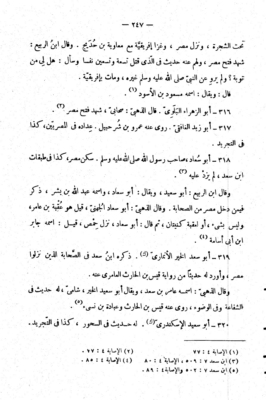 وقال ابن الربيع: أبو سعيد، ويقال: أبو سعاد، واسمه عبد الله بن بشر، ذكر فيمن دخل مصر من الصحابة. وقال الذهبي: أبو سعاد الجهني، قيل هو عقبة بن عامر، وليس بشيء أو لعقبة كنيتان، ثم قال: أبو سعاد، نزل حمص، قيل: اسمه جابر بن أبي أسامة (¬4) .