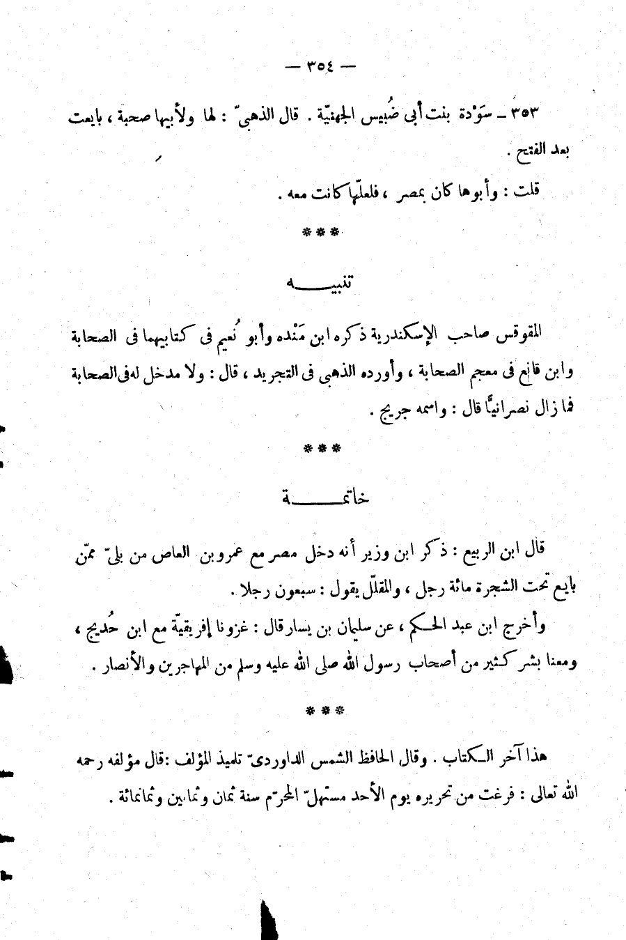 هذا آخر الكتاب. وقال الحافظ الشمس الداوردي تلميذ المؤلف: قال مؤلفه رحمه الله تعالى: فرغت من تحريره يوم الأحد مستهل المحرم سنة ثمان وثمانين وثمانمائة.