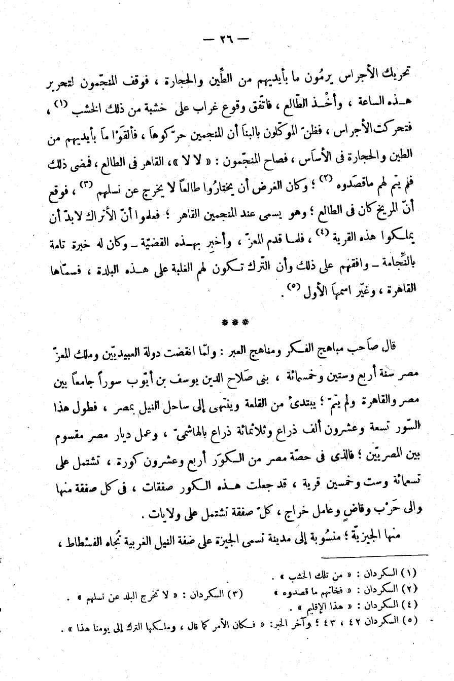 تحريك الأجراس يرمون ما بأيديهم من الطين والحجارة، فوقف المنجمون لتحرير هذه الساعة، وأخذ الطالع، فاتفق وقوع غراب على خشبة من ذلك الخشب (¬1) فتحركت الأجراس، فظن الموكلون بالبنا أن المنجمين حركوها، فألقوا ما بأيديهم من الطين والحجارة في الأساس، فصاح المنجمون: "لا لا"، القاهر في الطالع، فمضى ذلك فلم يتم لهم ما قصدوه (¬2) ؛ وكان الغرض أن يختاروا طالعًا لا يخرج عن نسلهم (¬3) ، فوقع أن المريخ كان في الطالع؛ وهو يسمى عند المنجمين القاهر؛ فعلموا أن الأتراك لا بد أن يملكوا هذه القرية (¬4) ، فلما قدم المعز، وأُخبر بهذه القضية -وكان له خبرة تامة بالنجمة- وافقهم على ذلك وأن الترك تكون لهم الغلبة على هذه البلدة، فسماها القاهرة، وغير اسمها الأول (¬5) .
