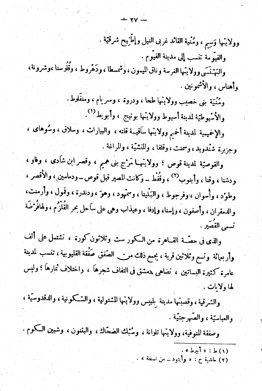 والذي في حصة القاهرة من الكور ست وثلاثين كورة، تشتمل على ألف وأربعمائة وتسع وثلاثين قرية، يجمع ذلك من الصفق صفقة القليوبية، تنسب لمدينة عامرة كثيرة البساتين، تضاهي دمشق في التفاف شجرها، واختلاف ثمارها؛ وليس لها ولايات.