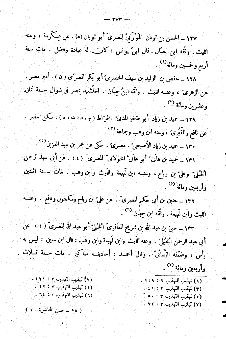 132- حنين بن أبي حكيم المصري. عن علي بن رباح ومكحول ونافع. وعنه الليث وابن لهيعة. وثقه ابن حبان (¬6) .