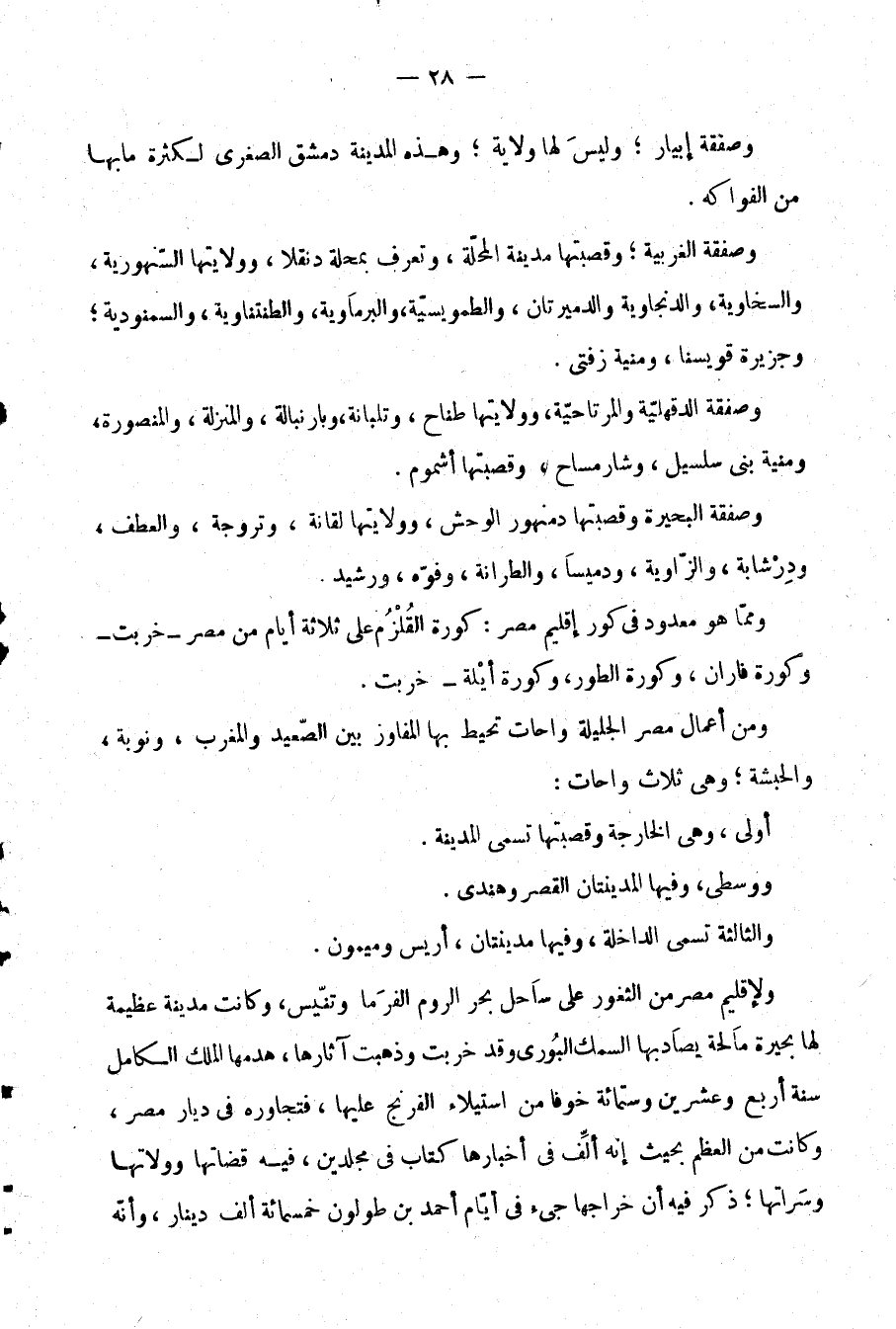 ولإقليم مصر من الثغور على ساحل بحر الروم الفرما وتنيس، وكانت مدينة عظيمة لها بحيرة مالحة يصاد بها السمك البوري وقد خربت وذهبت آثارها، هدمها الملك الكامل سنة أربع وعشرين وستمائة خوفًا من استيلاء الفرنج عليها، فتجاوره في ديار مصر، وكانت من العظم بحيث إنه ألف في أخبارها كتاب في مجلدين، فيه قضاتها وولاتها وسراتها؛ ذكر فيه أن خراجها في أيام أحمد بن طولون خمسمائة ألف دينار، وأنه