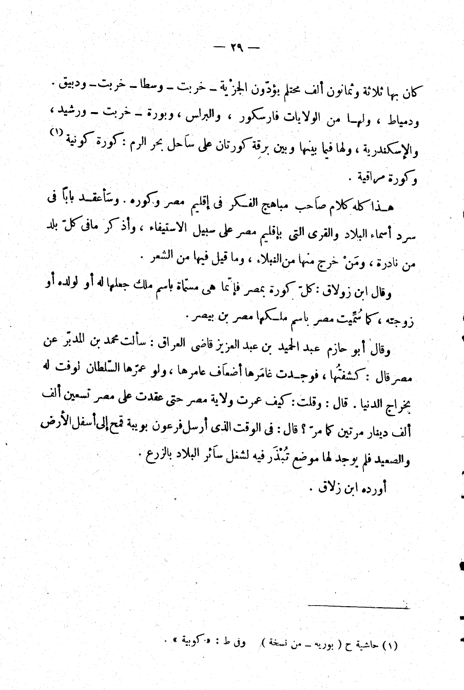 هذا كله كلام صاحب مباهج الفكر في إقليم مصر وكوره. وسأعقد بابًا في سرد أسماء البلاد والقرى التي بإقليم مصر على سبيل الاستيفاء، وأذكر ما في كل بلد من نادرة، ومن خرج منها من النبلاء، وما قيل فيها من الشعر.