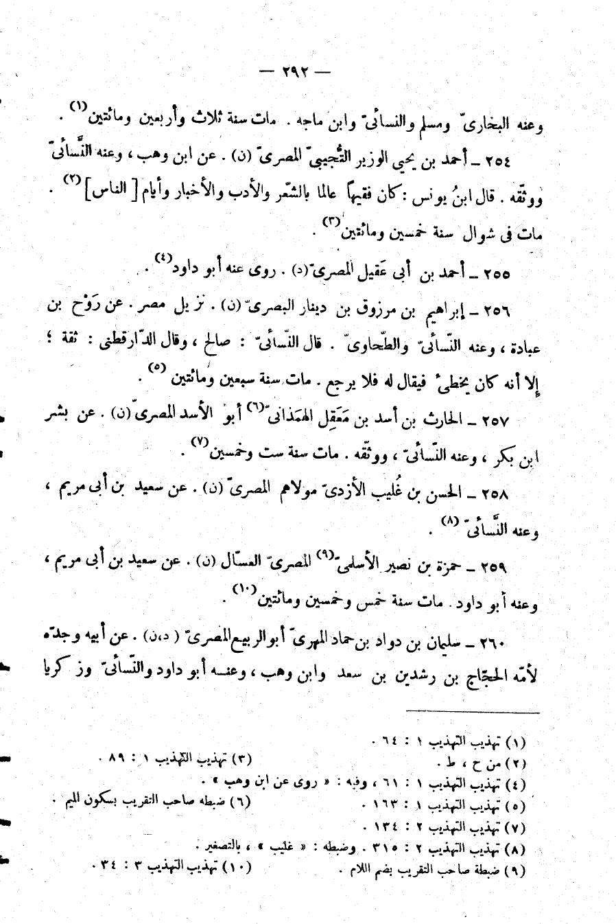 257- الحارث بن أسد بن معقل الهمذاني (¬6) أبو الأسد المصري "ن". عن بشر بن بكر، وعنه النسائي، ووثقه. مات سنة ست وخمسين (¬7) .