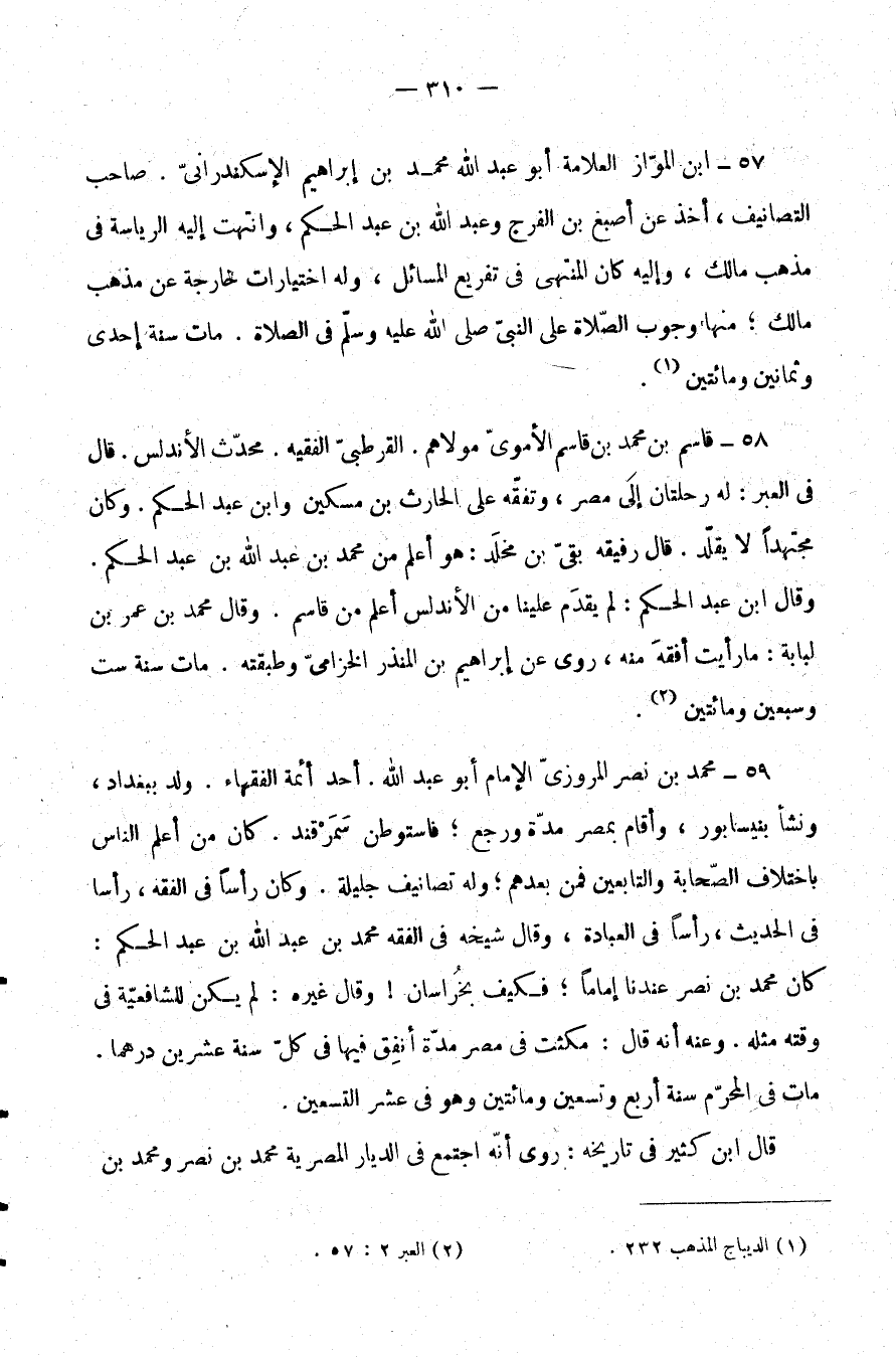 58- قاسم بن محمد بن قاسم الأموي مولاهم. القرطبي الفقيه. محدث الأندلس. قال في العبر: له رحلتان إلى مصر، وتفقه على الحارث بن مسكين وابن عبد الحكم. وكان مجتهدًا لا يقلد. قال رفيقه بقيّ بن مخلد: هو أعلم من محمد بن عبد الله بن عبد الحكم. وقال ابن عبد الحكم: لم يقدم علينا من الأندلس أعلم من قاسم. وقال محمد بن عمر بن لبابة: ما رأيت أفقه منه، روى عن إبراهيم بن المنذر الخزامي وطبقته. مات سنة ست وسبعين ومائتين (¬2) .