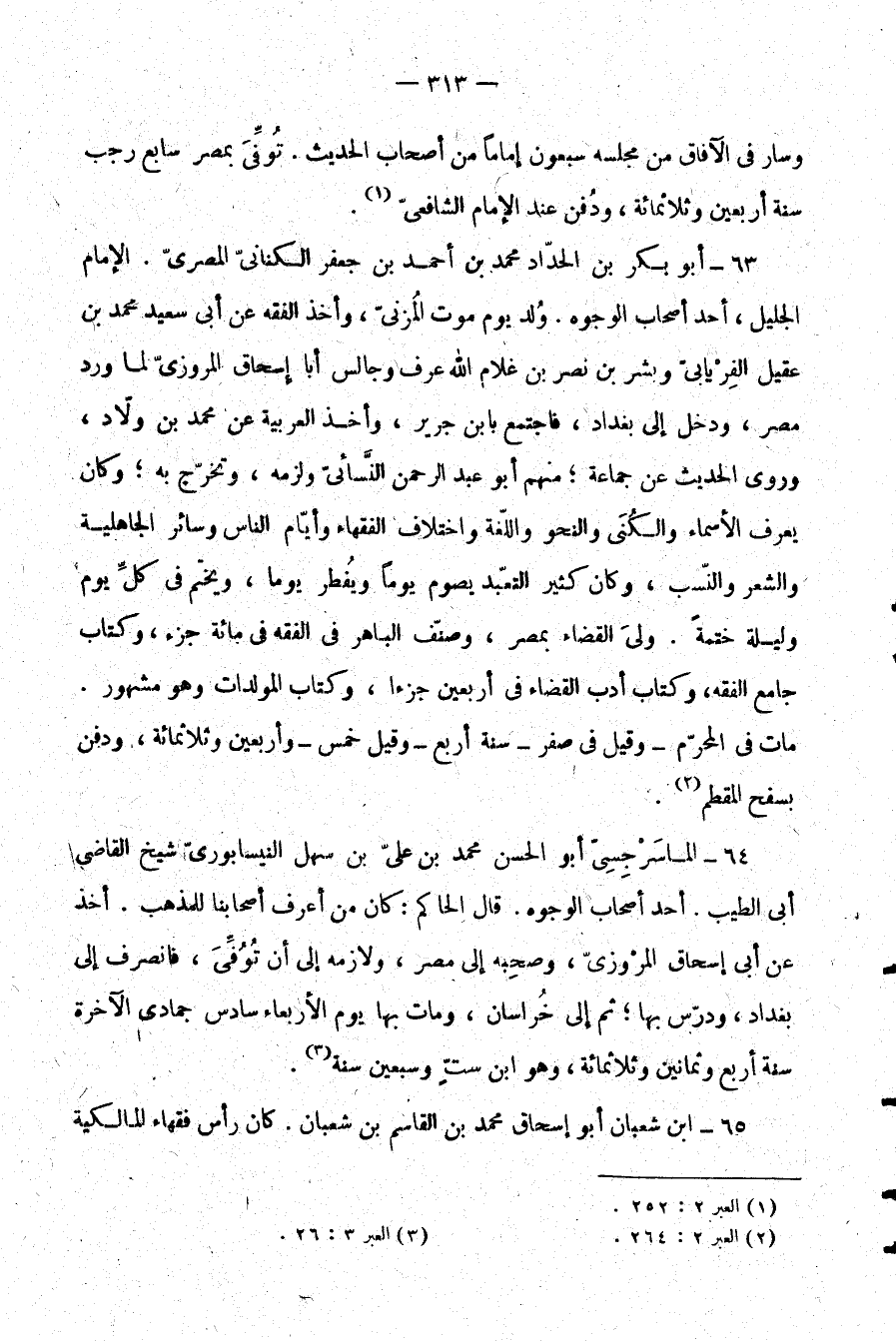 63- أبو بكر بن الحداد محمد أحمد بن جعفر الكناني المصري. الإمام الجليل، أحد أصحاب الوجوه. ولد يوم موت المزني، وأخذ الفقه عن أبي سعيد محمد بن عقيل الفريابي وبشر بن نصر بن غلام الله عرف وجالس أبا إسحاق المروزي لما ورد مصر، ودخل إلى بغداد، فاجتمع بابن جرير، وأخذ العربية عن محمد بن ولاد، وروى الحديث عن جماعة؛ منهم أبو عبد الرحمن النسائي ولزمه، وتخرج به؛ يعرف الأسماء والكنى والنحو واللغة واختلاف الفقهاء وأيام