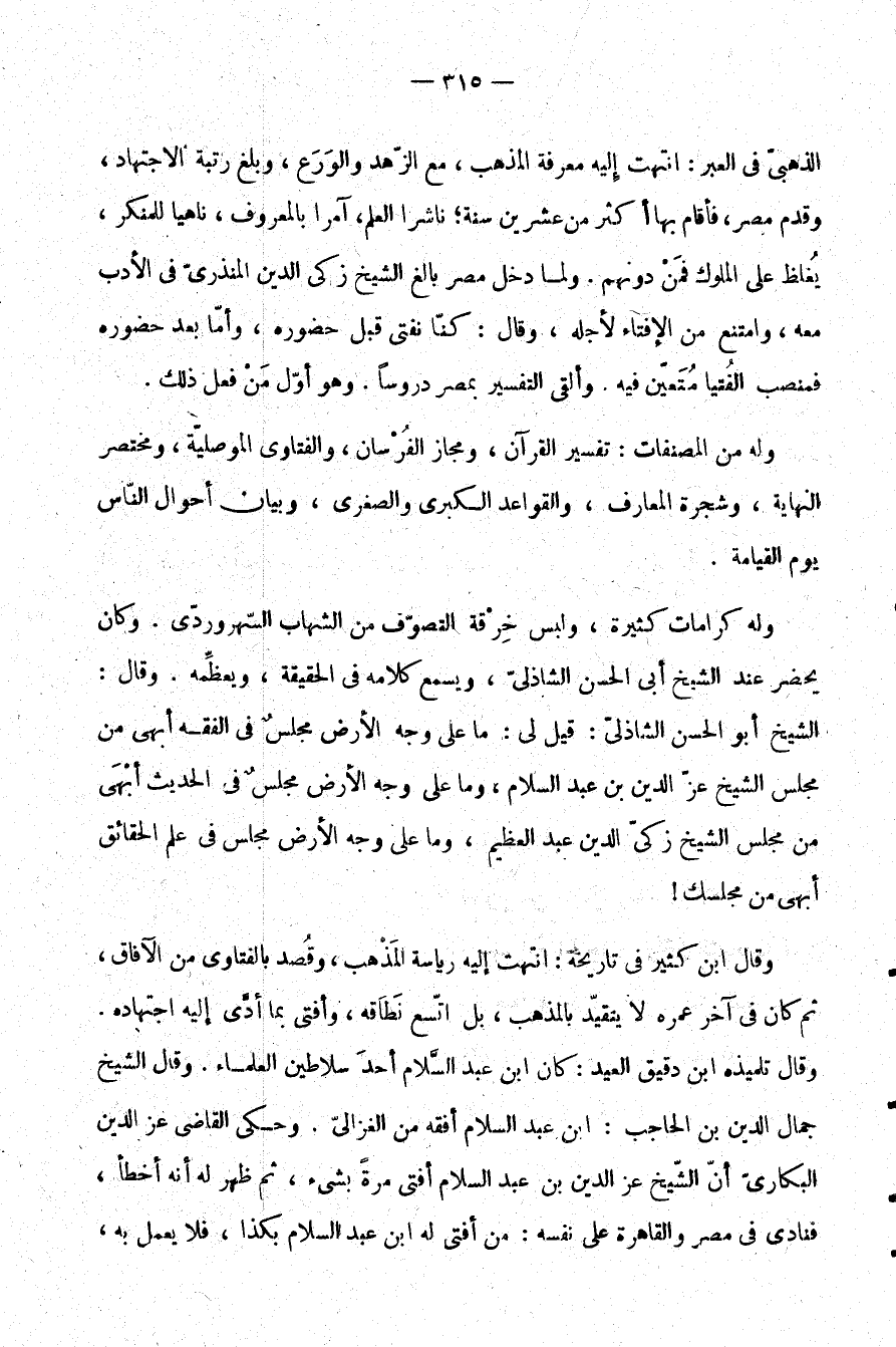 الذهبي في العبر: انتهت إليه معرفة المذهب، مع الزهد والورع، وبلغ رتبة الاجتهاد، وقدم مصر، فأقام بها أكثر من عشرين سنة؛ ناشرا العلم، آمرا بالمعروف، ناهيا للمنكر، يغلظ على الملوك فمن دونهم. ولما دخل مصر بالغ الشيخ زكي الدين المنذري في الأدب معه، وامتنع من الإفتاء لأجله، وقال: كنا نفتي قبل حضوره، وأما بعد حضوره فمنصب الفتيا متعين فيه. وألقى التفسير بمصر دروسا. وهو أول من فعل ذلك.