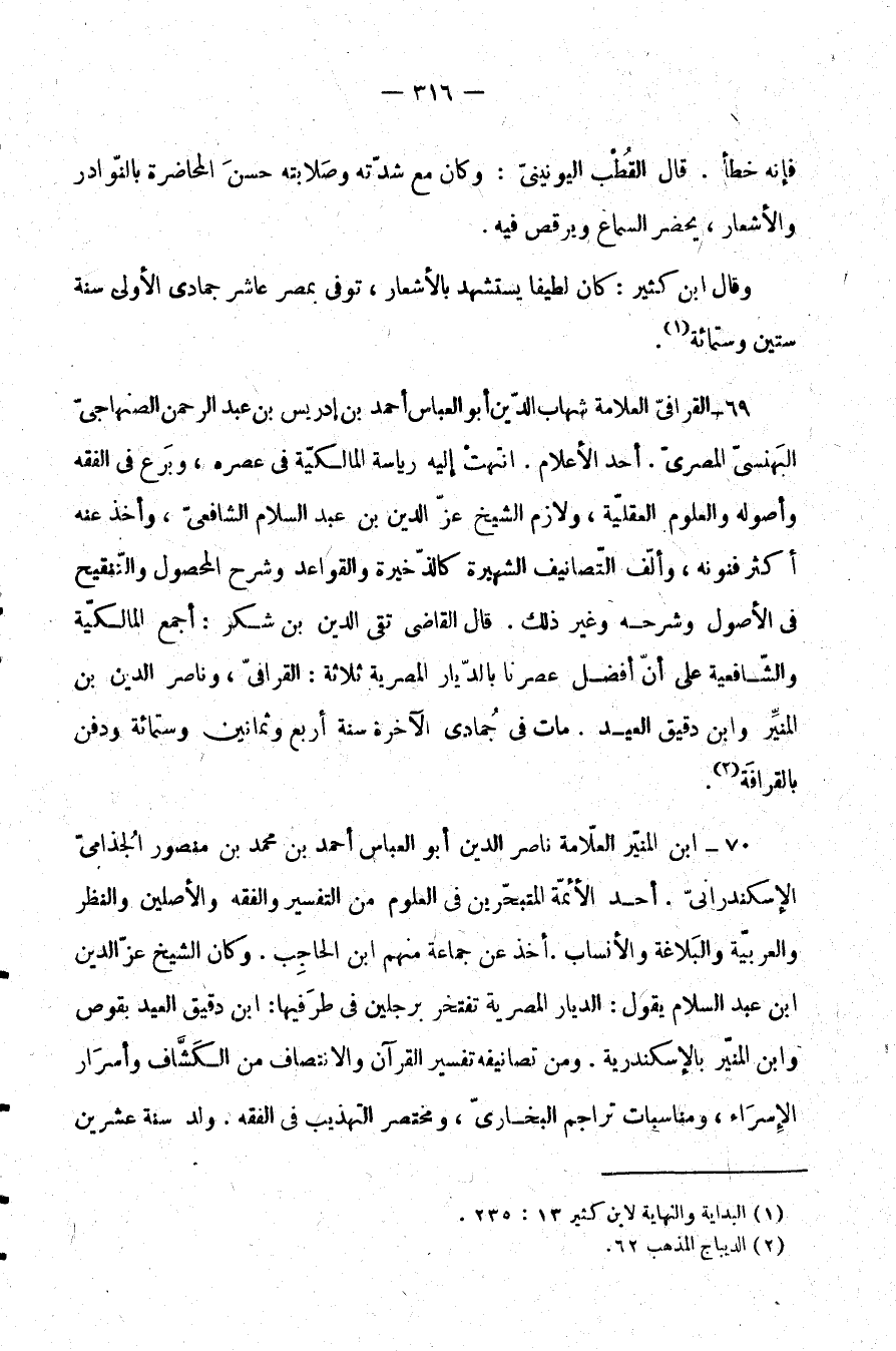 69- القرافي العلامة شهاب الدين أبو العباس أحمد بن عبد الرحمن الصنهاجي البهنسي المصري. أحد الأعلام. انتهت إليه رياسة المالكية في عصره، وبرع في الفقه وأصوله والعلوم العقلية، ولازم الشيخ عز الدين بن عبد السلام الشافعي، وأخذ عنه أكثر فنونه، وألف التصانيف الشهيرة كالذخيرة والقواعد وشرح المحصول والتنقيح في الأصول وشرحه وغير ذلك. قال القاضي تقي الدين بن شكر: أجمع المالكية والشافعية على أن أفضل عصرنا بالديار المصرية ثلاثة: القرافي، وناصر الدين بن المنير وابن دقيق العيد. مات في جمادى الآخرة سنة أربع وثمانين وستمائة ودفن بالقرافة (¬2) .