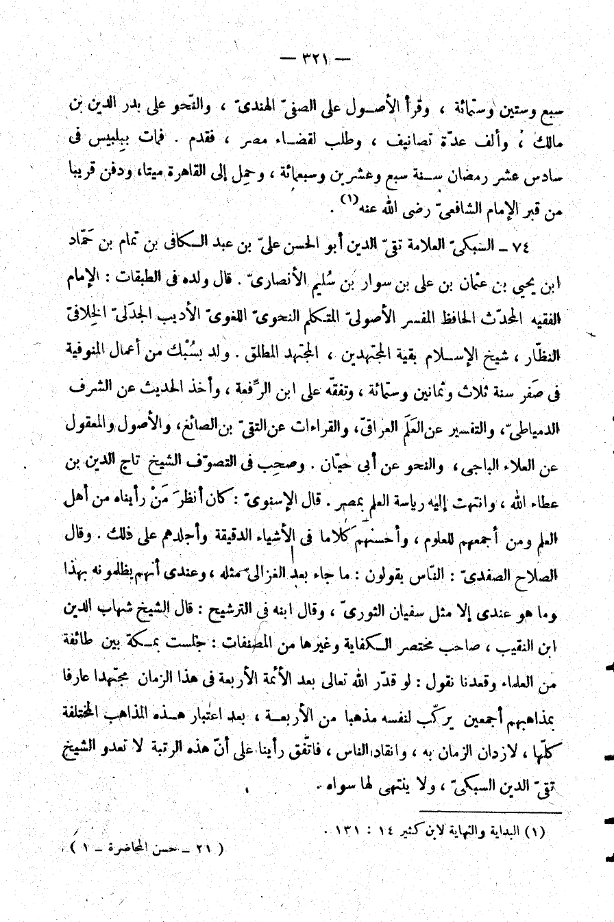 74- السبكي العلامة تقي الدين أبو الحسن علي بن عبد الكافي بن تمام بن حماد بن يحيى بن عثمان بن علي بن سوار بن سليم الأنصاري. قال ولده في الطبقات: الإمام الفقيه المحدث الحافظ المفسر الأصولي المتكلم النحوي اللغوي الأديب الجدلي الخلافي النظار، شيخ الإسلام بقية المجتهدين، المجتهد المطلق. ولد بسبك من أعمال المنوفية في صفر سنة ثلاث وثمانين وستمائة، وتفقه على ابن الرفعة، وأخذ الحديث عن الشرف الدمياطي، والتفسير عن العلم العارقي، والقراءات عن التقي بن الصائغ، والأصول والمعقول عن العلاء الباجي، والنحو عن أبي حيان. وصحب في التصوف الشيخ تاج الدين بن عطاء الله، وانتهت إليه