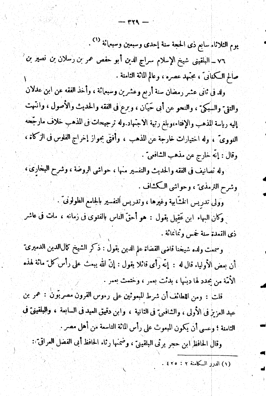 76- البلقيني شيخ الإسلام سراج الدين أبو حفص عمر بن رسلان بن نصير بن صالح الكناني، مجتهد عصره، وعالم المائة الثامنة.