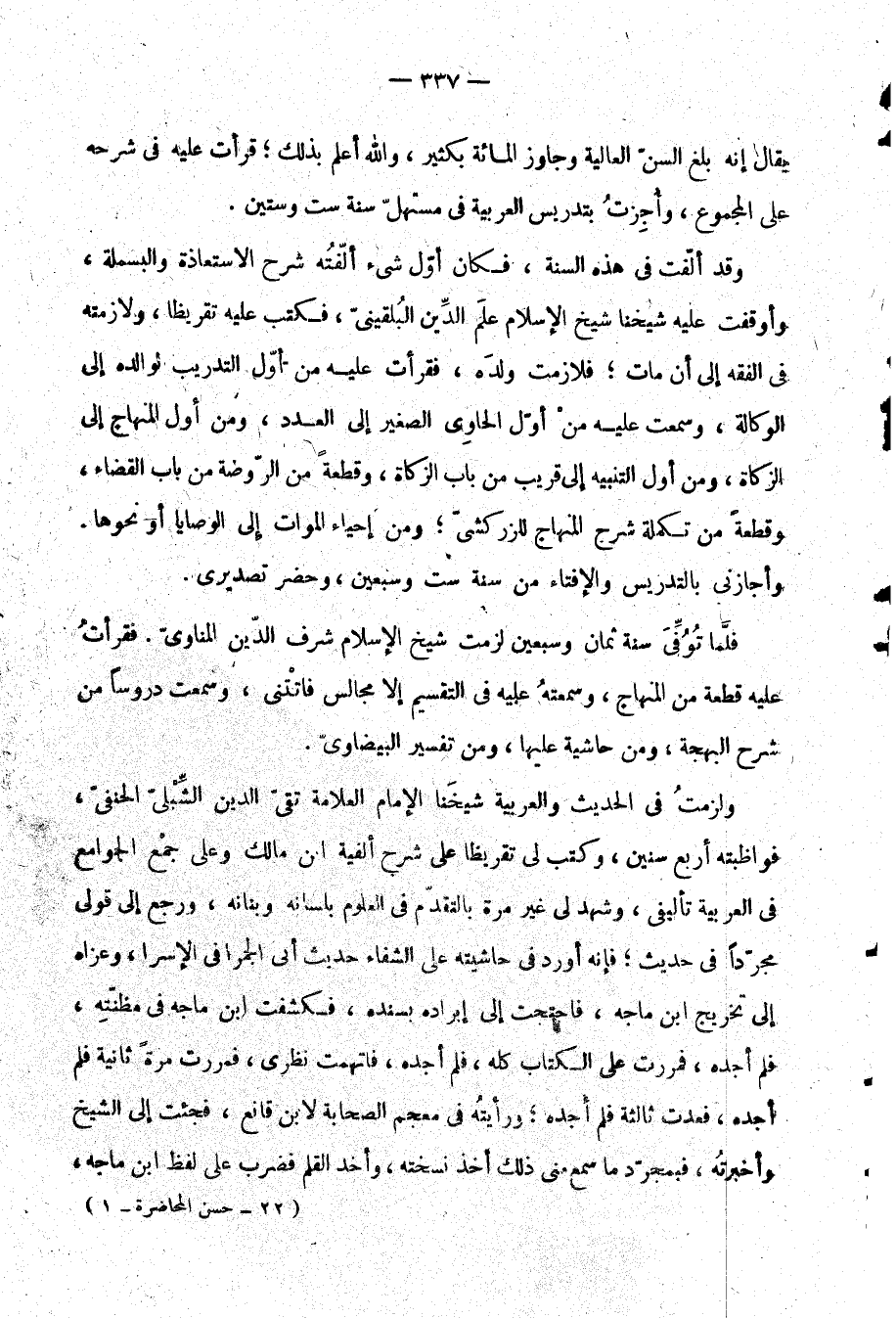 ولزمت في الحديث والعربية شيخنا الإمام العلامة تقي الدين الشبلي الحنفي، فواظبته أربع سنين، وكتب لي تقريظا على شرح ألفية ابن مالك وعلى جمع الجوامع في العربية تأليفي، وشهد لي غير مرة بالتقدم في العلوم بلسانه وبنانه، ورجع إلى قولي مجردا في حديث؛ فإنه أورد في حاشيته على الشفاء حديث أبي الجمرا في الإسرا، وعزاه إلى تخريج ابن ماجه، فاحتجت إلى إيراده بسنده، فكشفت ابن ماجه في مظنته، فلم أجده، فمررت على الكتاب كله، فلم أجده، فاتهمت نظري، فمررت مرة ثانية فلم أجده، فعدت ثالثة فلم اجده؛ ورأيته في معجم الصحابة لابن قانع، فجئت إلى الشيخ وأخبرته، فبمجرد ما سمع مني ذلك أخذ نسخته، وأخذ القلم فضرب على لفظ ابن ماجه،