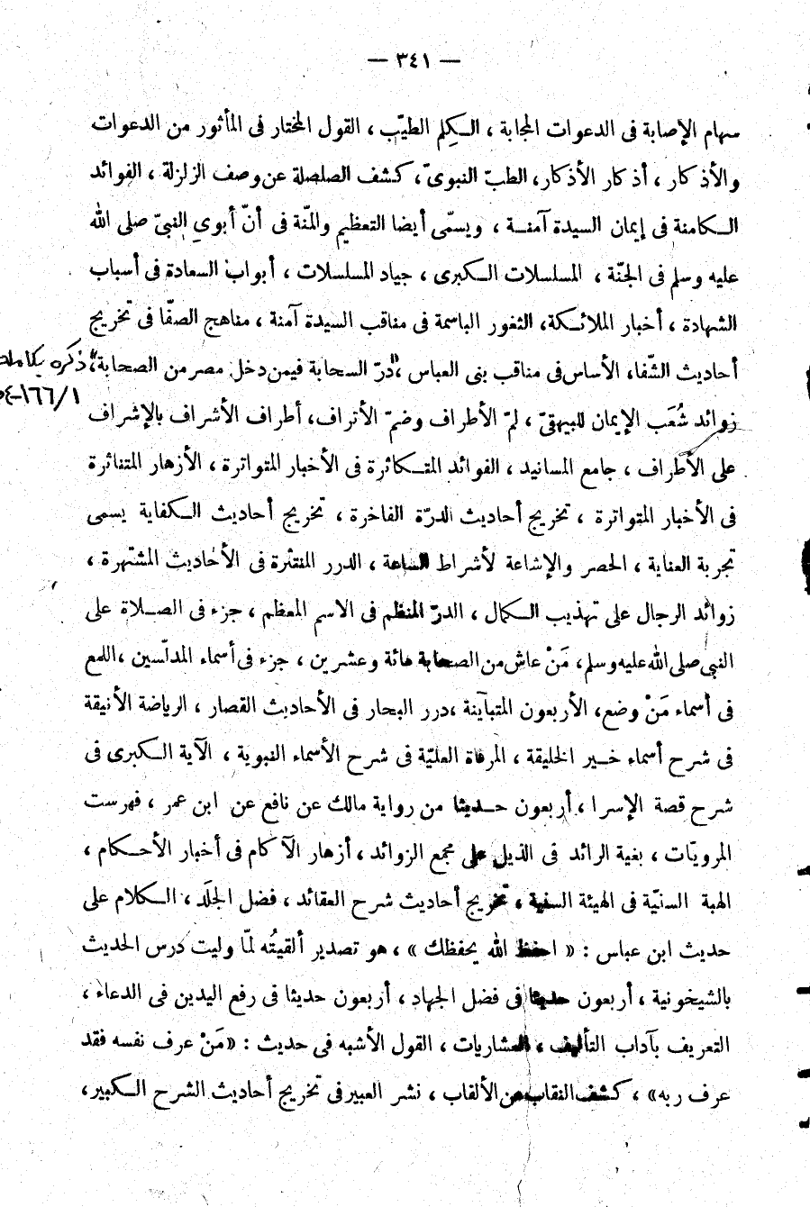 سهام الإصابة في الدعوات المجابة، الكلم الطيب، القول المختار في المأثور من الدعوات والأذكار، أذكار الأذكار، الطب النبوي، كشف الصلصلة عن وصف الزلزلة، الفوائد الكامنة في إيمان السيدة آمنة، ويسمى أيضًا التعظيم والمنة في أن أبوي النبي صَلَّى اللَّهُ عَلَيْهِ وَسَلَّمَ في الجنة، المسلسلات الكبرى، جياد المسلسلات، أبواب السعادة في أسباب الشهادة، أخبار الملائكة، الثغور الباسمة في مناقب السيدة آمنة، مناهج الصفا في تخريج أحاديث الشفا، الأساس في مناقب بني العباس، در السحابة فيمن دخل مصر من الصحابة، زوائد شعب الإيمان للبيهقي، لم الأطراف وضم الأتراف، أطراف الأشراف بالإشراف على الأطراف، جامع المسانيد، الفوائد المتكاثرة في الأخبار المتواترة، الأزهار المتناثرة في الأخبار المتواترة، تخريج أحاديث الدرة الفاخرة، تخريج أحاديث الكفاية يسمى تجربة العناية، الحصر والإشاعة لأشراط الساعة، الدرر المتنثرة في الأحاديث المشتهرة، زوائد الرجال على تهذيب الكمال، الدر المنظم في الاسم المعظم، جزء في الصلاة على النبي صَلَّى اللَّهُ عَلَيْهِ وَسَلَّمَ، من عاش من الصحابة مائة وعشرين، جزء في أسماء المدلسين، اللمع في أسماء من وضع، الأربعون المتباينة، درر البحار في الأحاديث القصار، الرياضة الأنيقة في شرح أسماء خير الخليقة، المرقاة العلية في شرح الأسماء النبوية، الآية الكبرى في شرح قصة الإسرا، أربعون حديثًا من رواية مالك عن نافع عن ابن عمر، فهرست المرويات، بغية الرائد في الذيل على مجمع الزوائد، أزهار الآكام في أخبار الأحكام، الهبة السنية في الهيئة السنية، تخريج أحاديث شرح العقائد، فضل الجلد، الكلام على حديث ابن عباس: "احفظ الله يحفظك"، هو تصدير ألقيته لما وليت درس الحديث بالشيخونية، أربعون حديثًا في فضل الجهاد، أربعون حديثًا في رفع اليدين في الدعاء، التعريف بآداب التأليف، العشاريات، القول الأشبه في حديث: "من عرف نفسه فقد عرف ربه"، كشف النقاب عن الألقاب، نشر العبير في تخريج أحاديث الشرح الكبير،